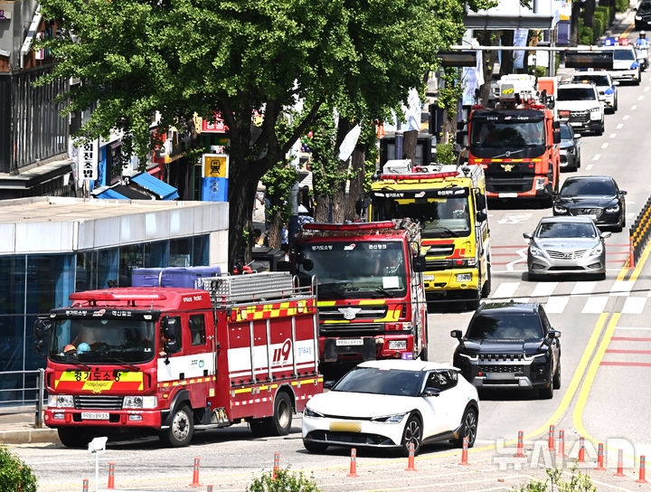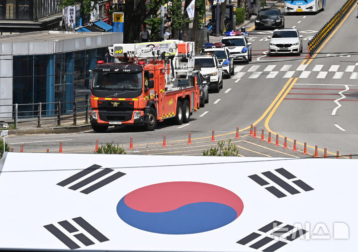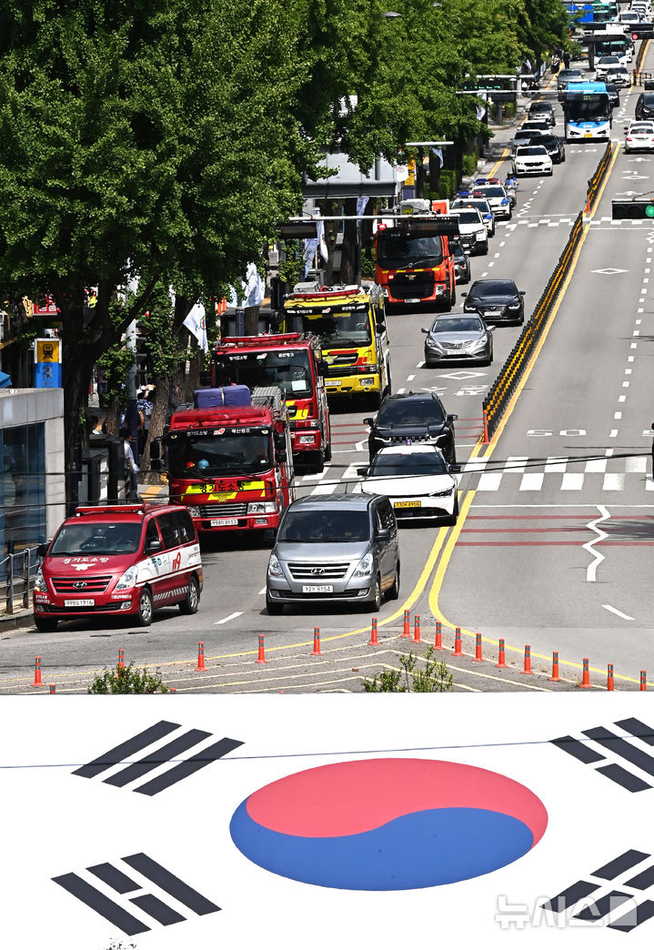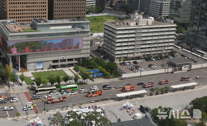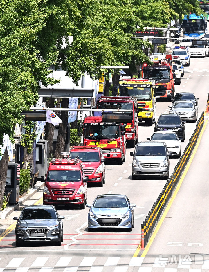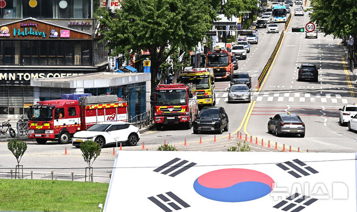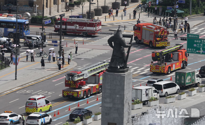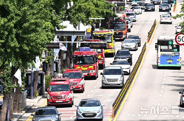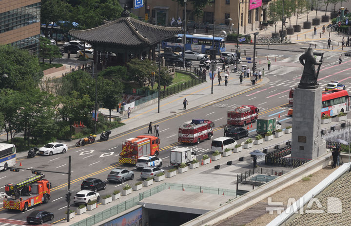 ソウル市鍾路区の光化門前で20日午後、民防衛訓練の一環である2025消防車優先通行訓練が行われている様子。