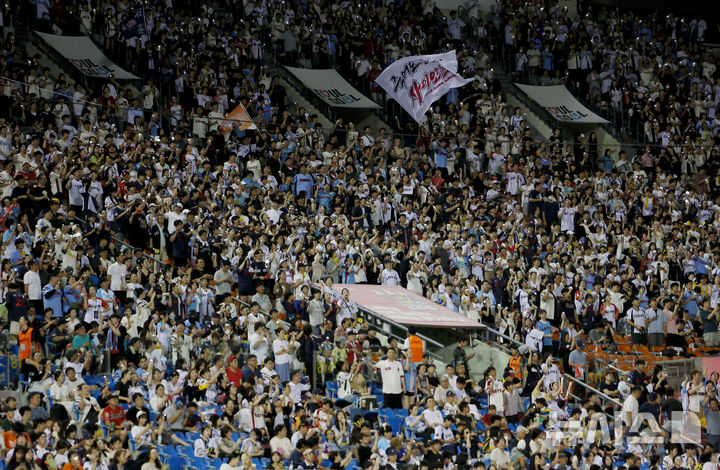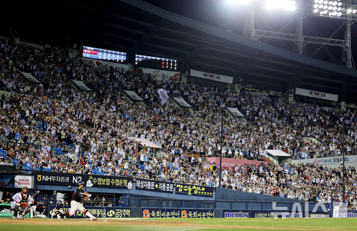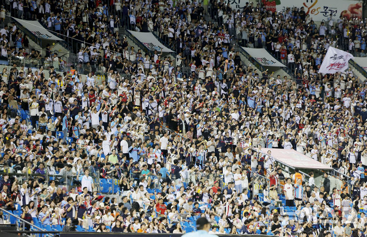 【NEWSIS】19日、ソウル市松坡区の蚕室スタジアムで、「2025韓国プロ野球(KBO)リーグ」ロッテ・ジャイアンツ対LGツインズの試合が行われた。写真は応援するファンたち。18日の時点で合計562試合に969万542人が入場し、観客1000万人まであと約31万人となった。気象条件悪化などがなく順調に行けば、今週中にも1000万人を突破するものと予想されている。