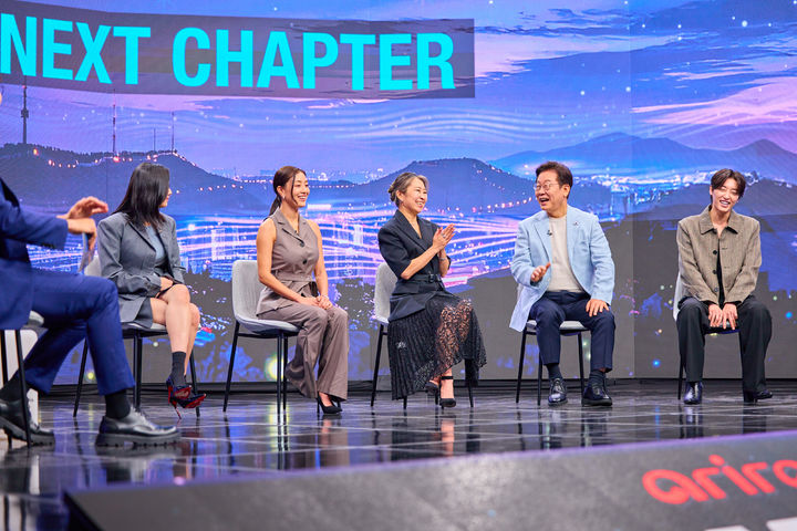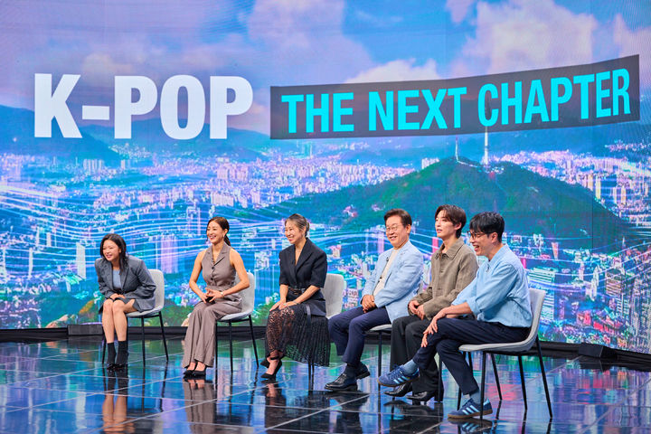 【NEWSIS】李在明(イ・ジェミョン)大統領は20日、ソウル市瑞草区のアリラン国際放送で、収録放送の形で放送された特別番組『K-POP:THE NEXT CHAPTER (ザ・ネクスト・チャプター)』に出演した。写真は出演者たちと記念撮影をする李在明大統領。