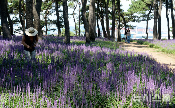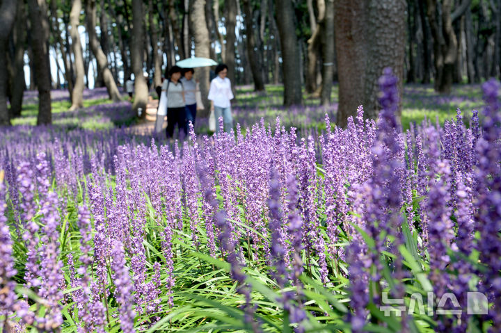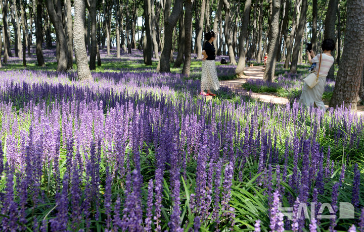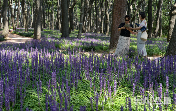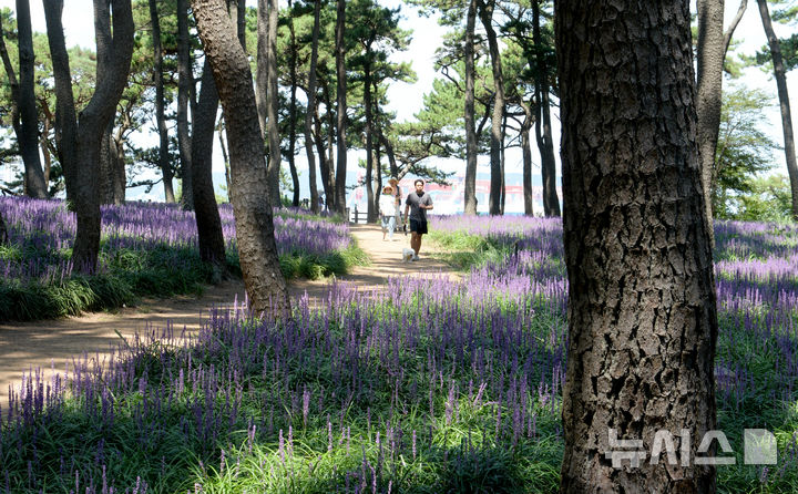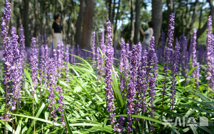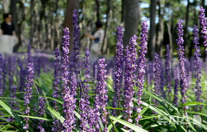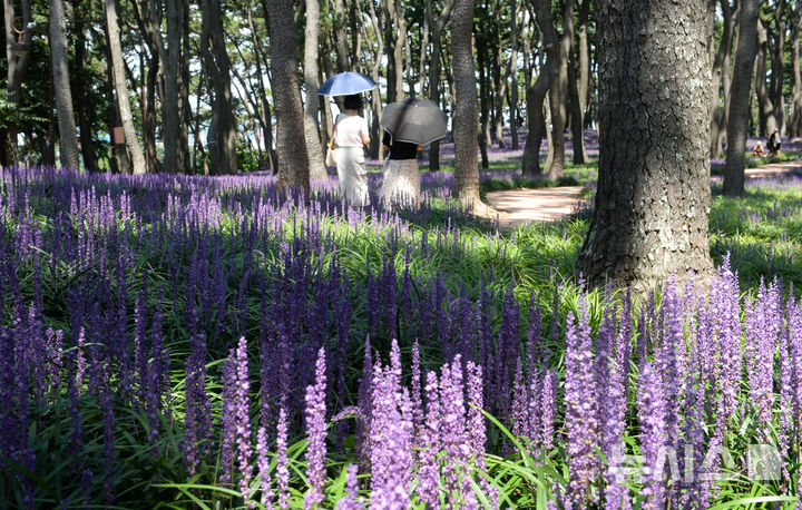 【NEWSIS】蔚山全域に猛暑注意報が発令された25日、蔚山市東区の大王岩公園一帯で、紫の花を大きく咲かせたヤブラン。