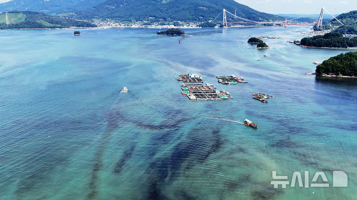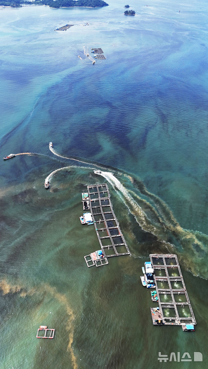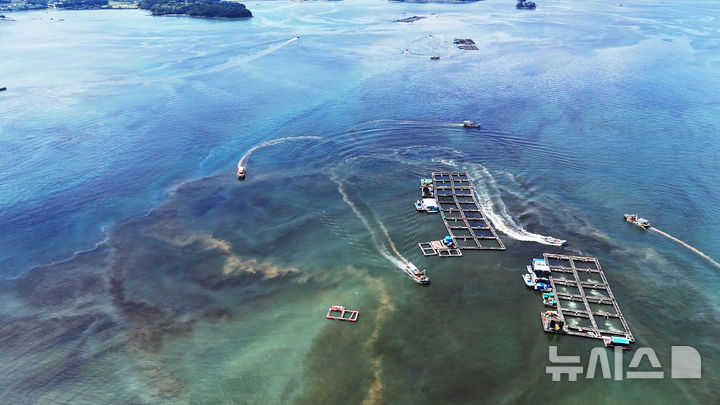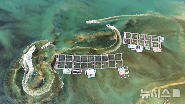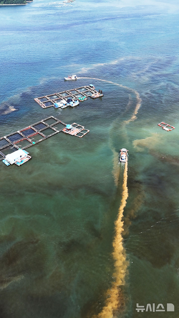 【NEWSIS】29日、慶尚南道南海郡古県面車面里の沿岸部では、赤潮が押し寄せて漁業者たちが防除作業に追われていた。