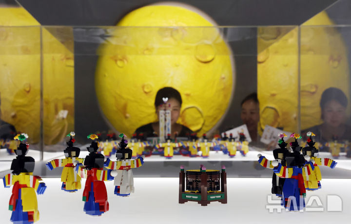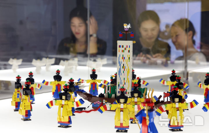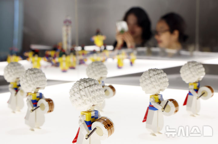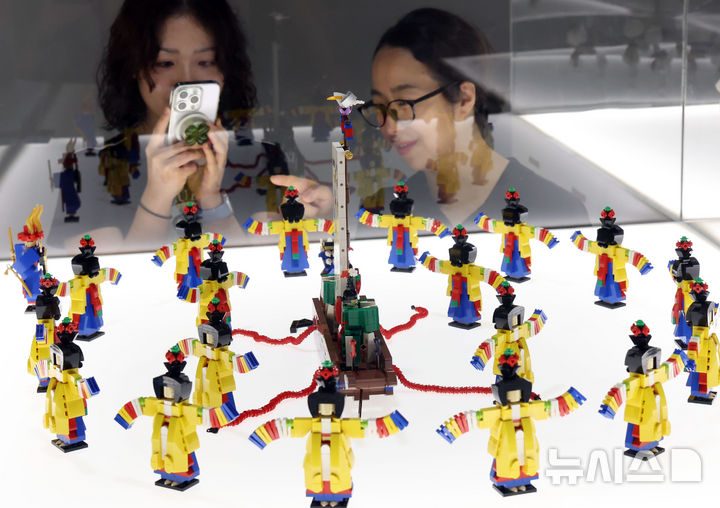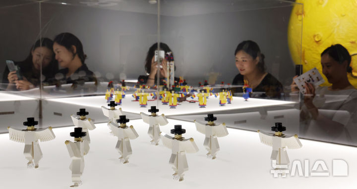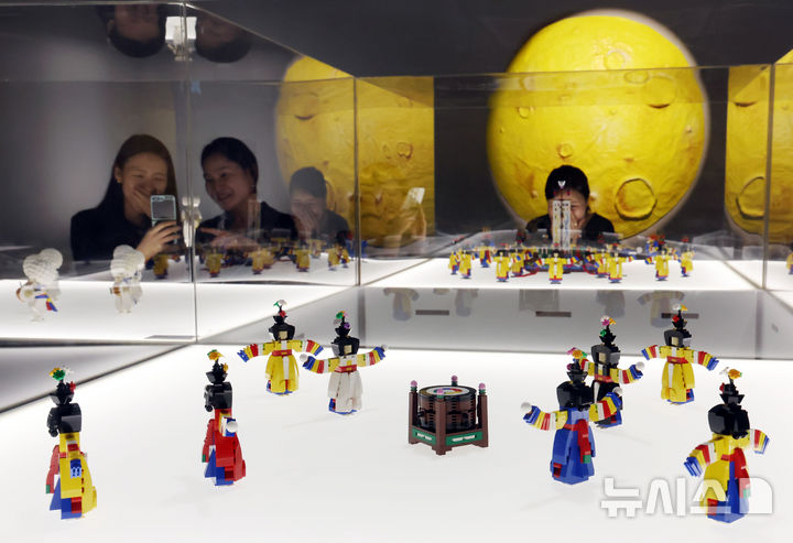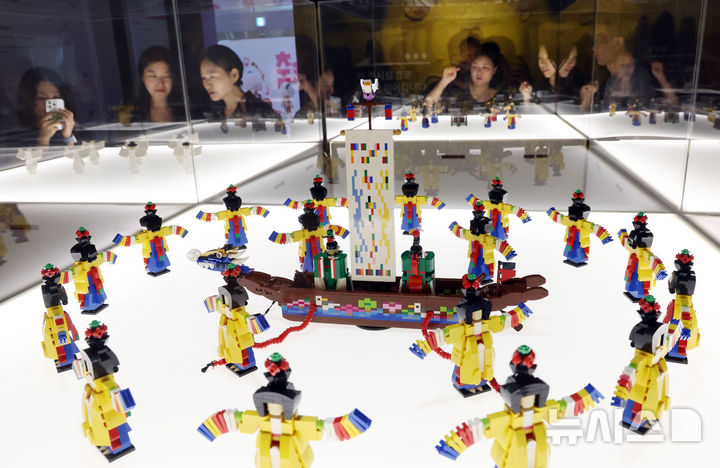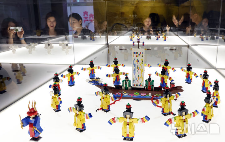 【NEWSIS】第8回嶺南ダンスフェスティバルとの連携展示「踊るレゴ」が行なわれた2日、釜山市釜山鎮区の国立釜山国楽院で、アーティストのコーリン・チン(Colin Jin)がレゴで表現した舞鼓、琴湖プクチュム(太鼓踊り)、東莱鶴チュム、東莱野遊、船遊楽など韓国伝統の踊りに関する作品を見て回る市民の様子。