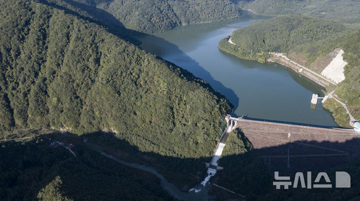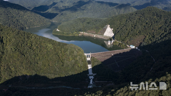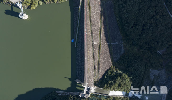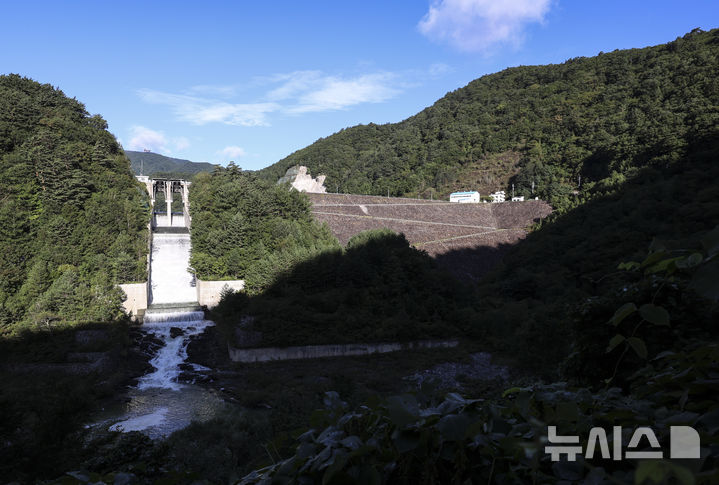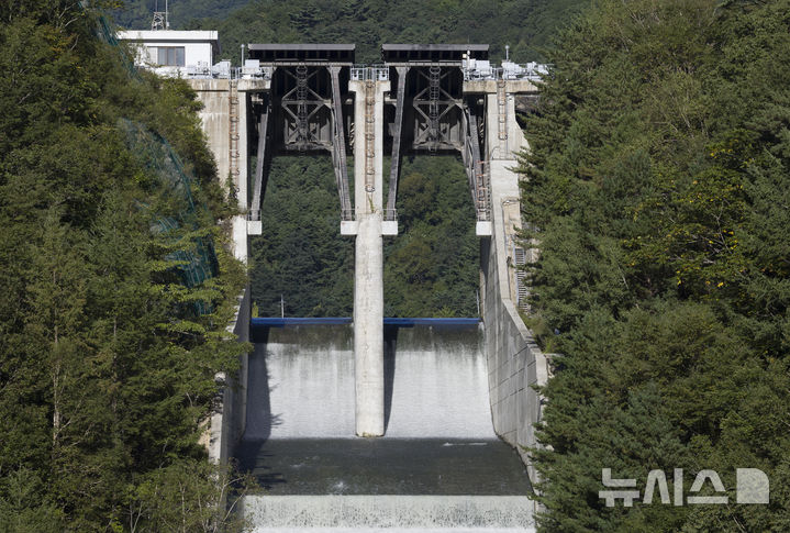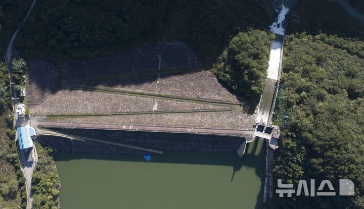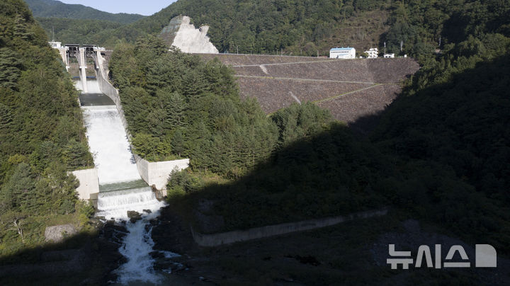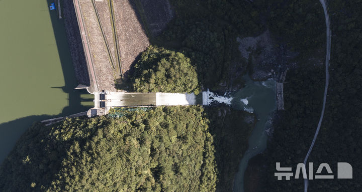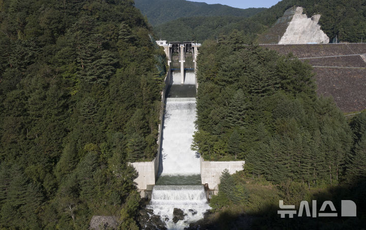 【NEWSIS】深刻な干ばつに見舞われている江原道江陵市では、道岩ダムの放流水を導水管を通じて一時的に受け入れることにした。写真は16日午前、江原道平昌郡大関嶺面の道岩ダムの放流の様子。