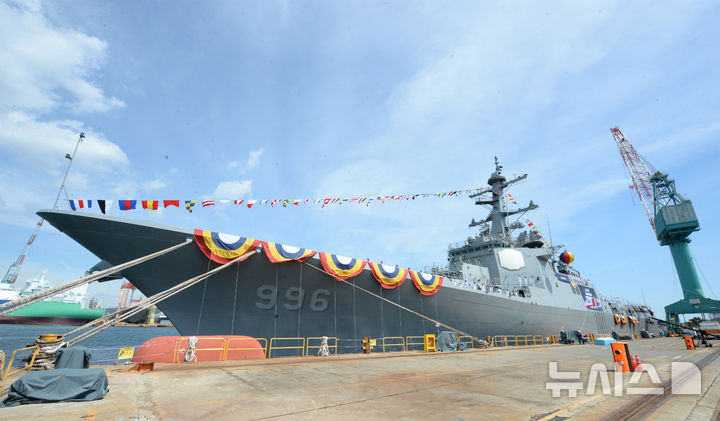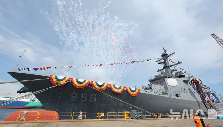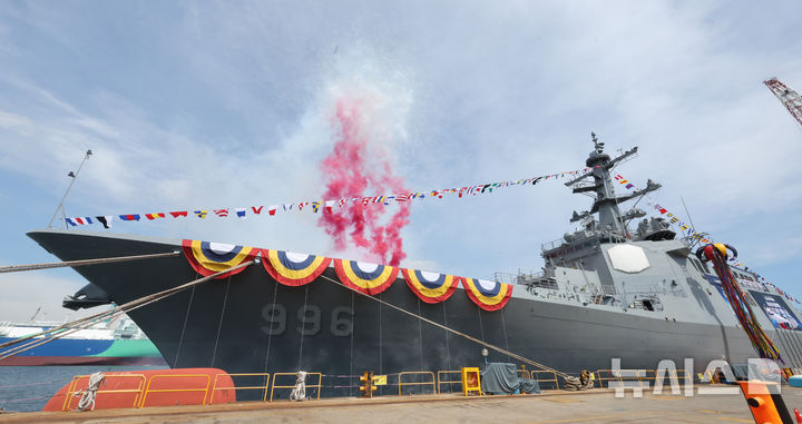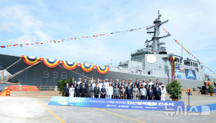 【NEWSIS】韓国海軍の中心戦力たる次世代イージス駆逐艦2番館「茶山丁若鏞」の進水式が17日、蔚山市東区のHD現代重工業特殊船事業部で行われているところ。