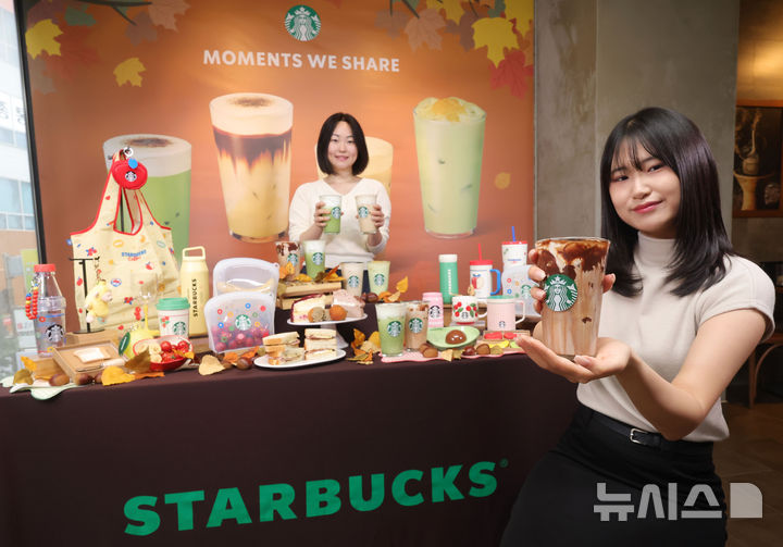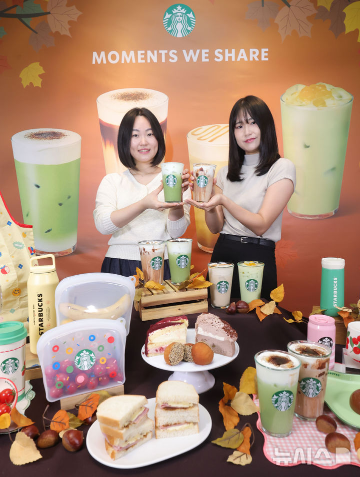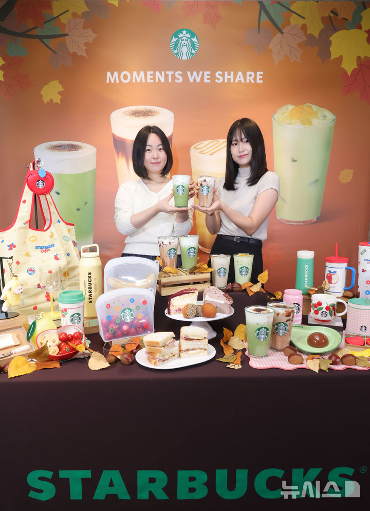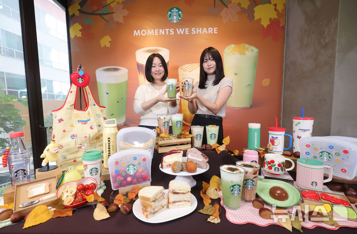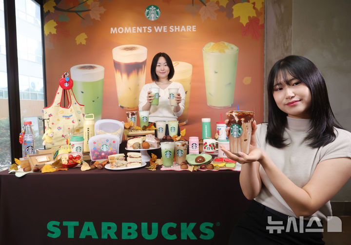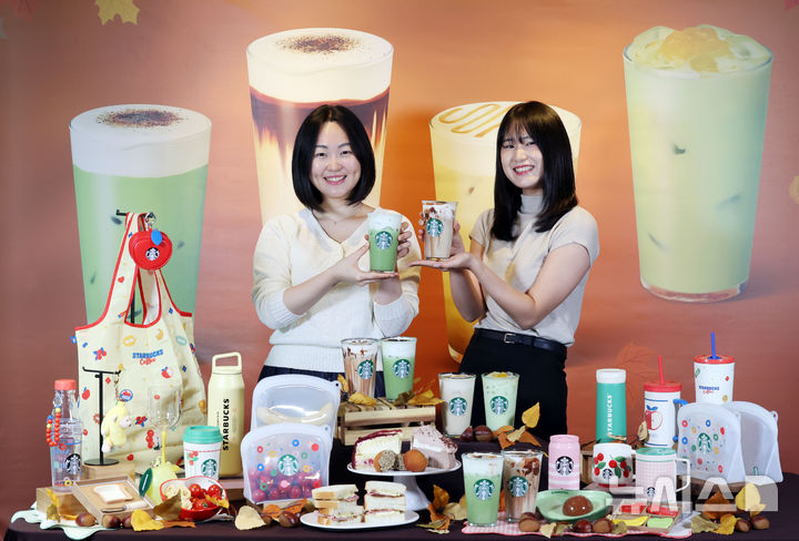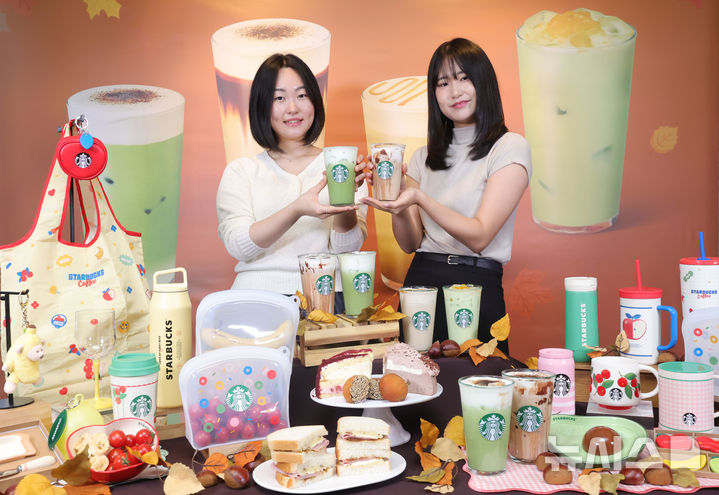 【NEWSIS】ソウル市中区のスターバックス韓国プレスセンター店で18日、秋シーズンに合わせてドリンク、フード、グッズなどのPRをしているコンパニオンの様子。