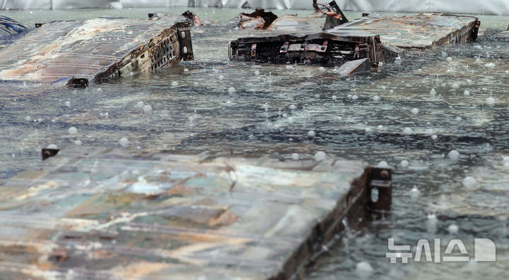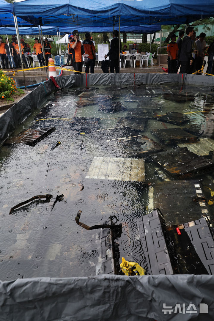 外部浸水槽で冷却作業中のリチウムイオン・バッテリーの上に雨が降っていた。