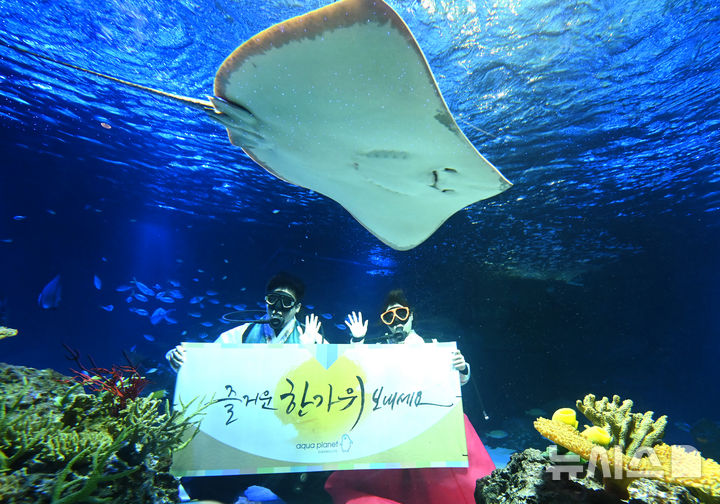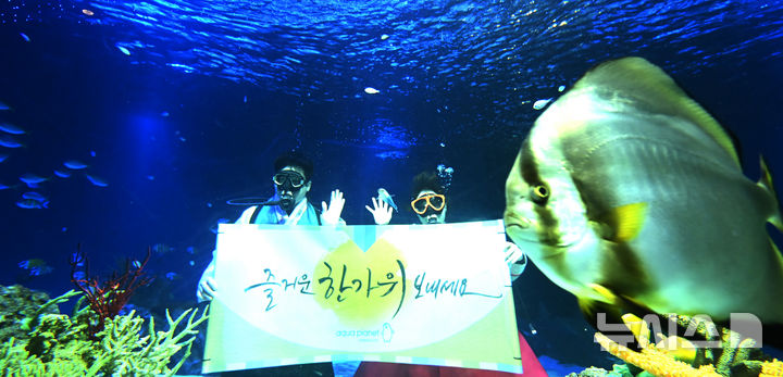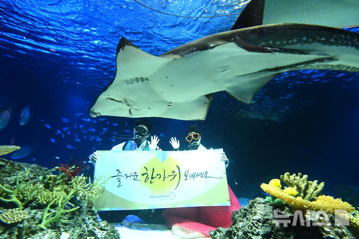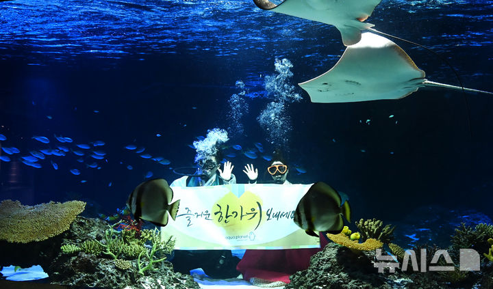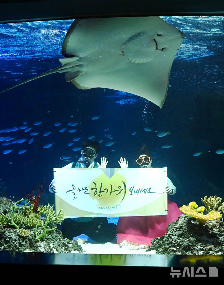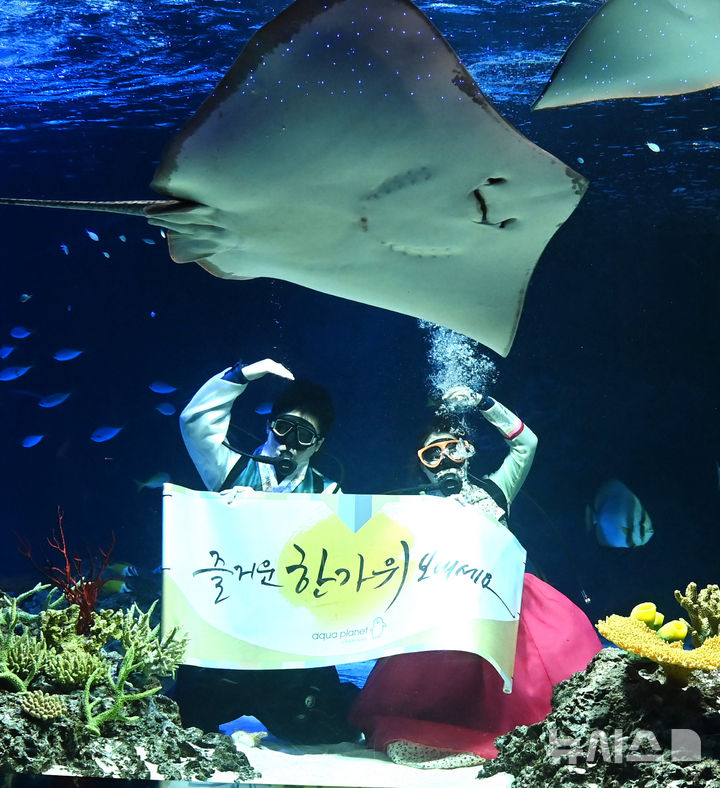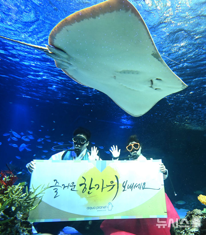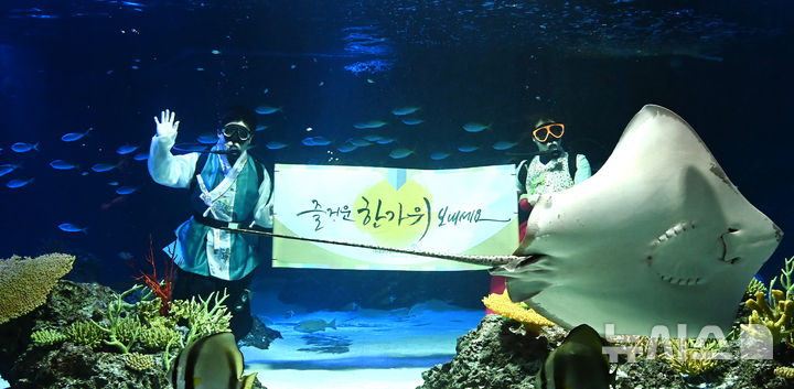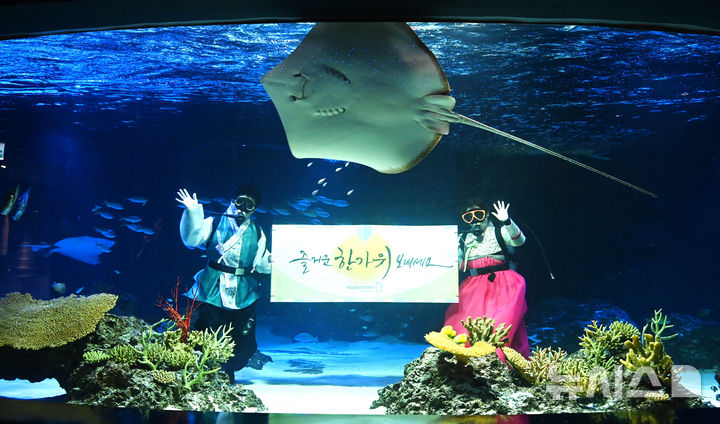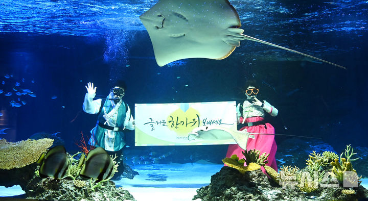 【NEWSIS】秋夕(中秋節。今年は10月6日)まであと1週間と迫った29日、京畿道水原市霊通区のアクアプラネット光橋で、韓服(韓国の伝統衣装)を着たアクアリストが秋夕を迎えるあいさつをしているところ。