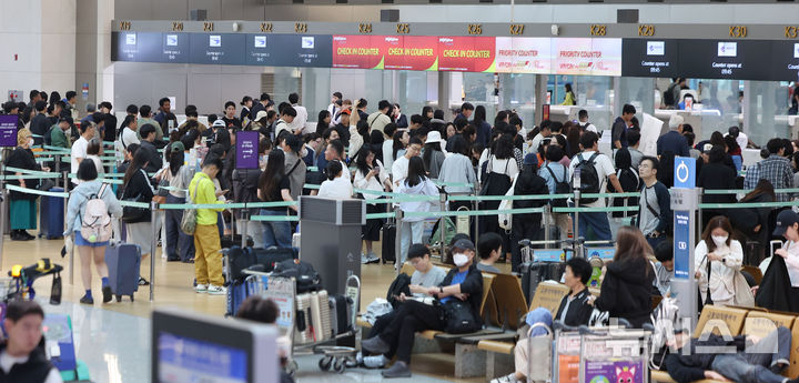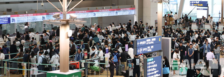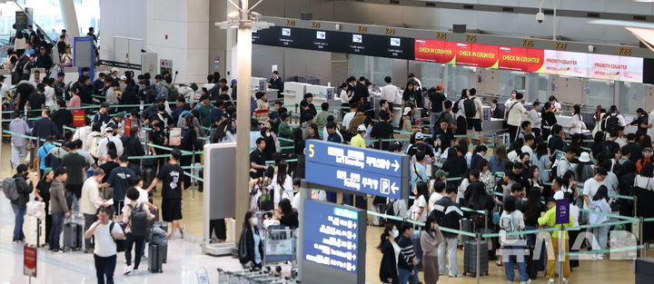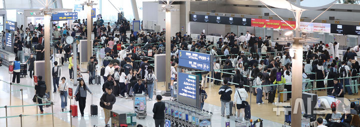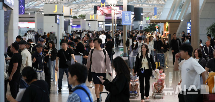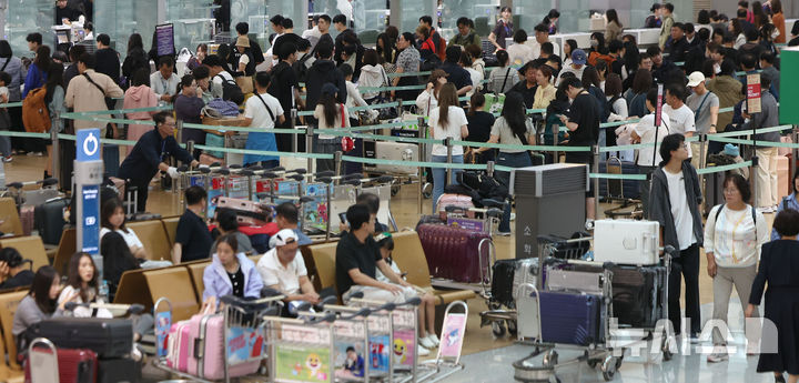【NEWSIS】開天節(建国記念日)かつ秋夕(中秋節。今年は10月6日)の連休初日の3日、仁川国際空港の出国場で出国手続きを行う旅行客の様子。