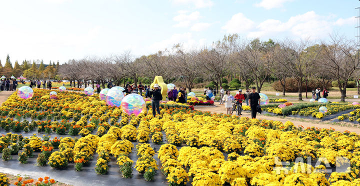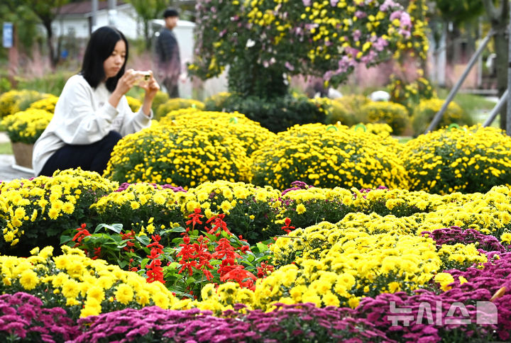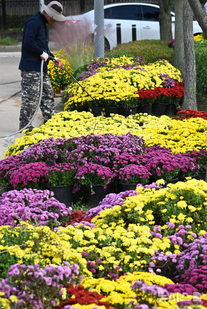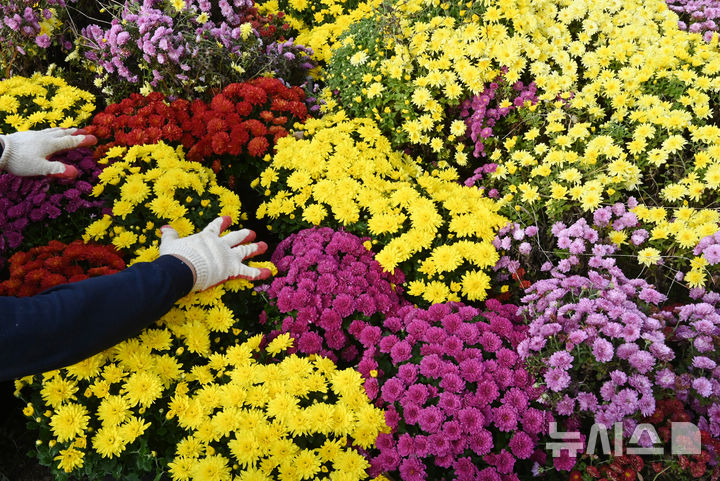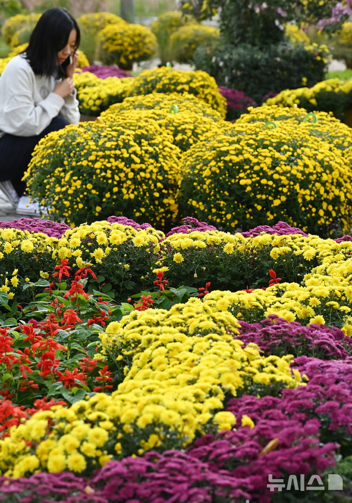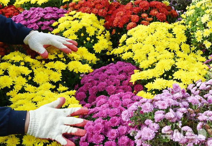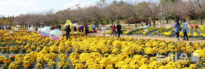 【NEWSIS】菊花芸術祭まであと二日と迫った23日、京畿道水原市霊通区のチソン公園では、色も形もさまざまなキクの花が咲いていた。