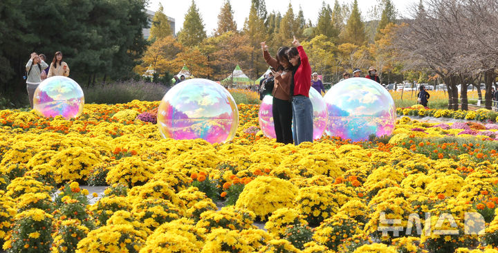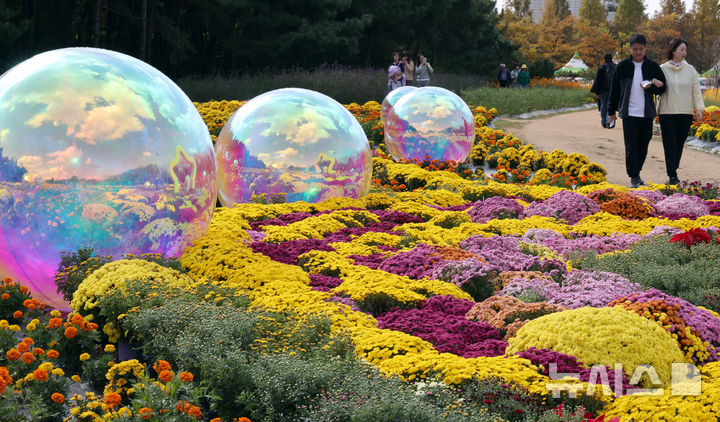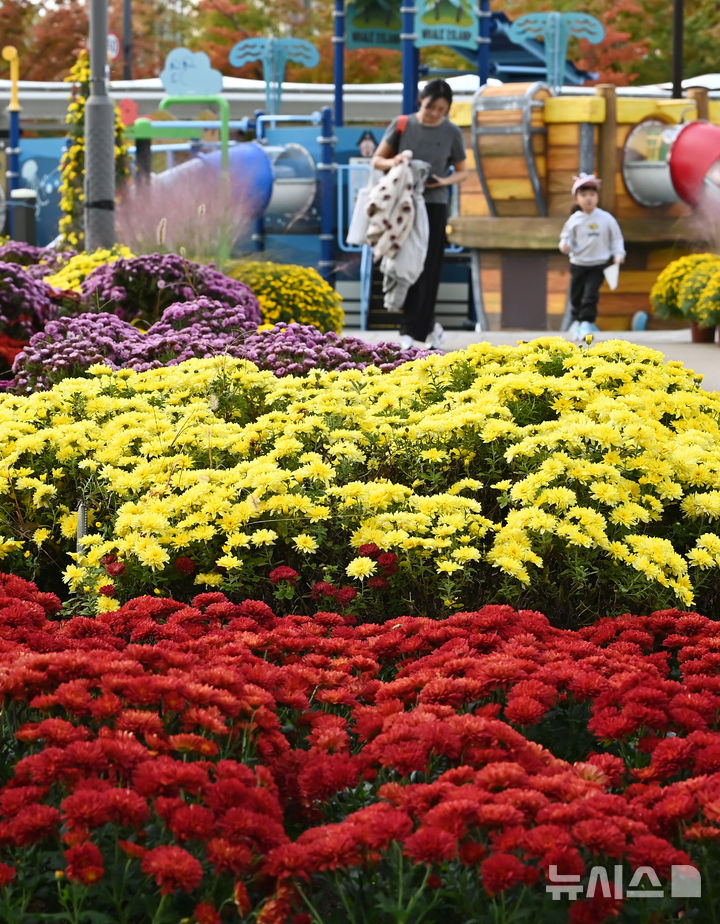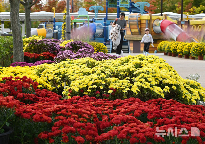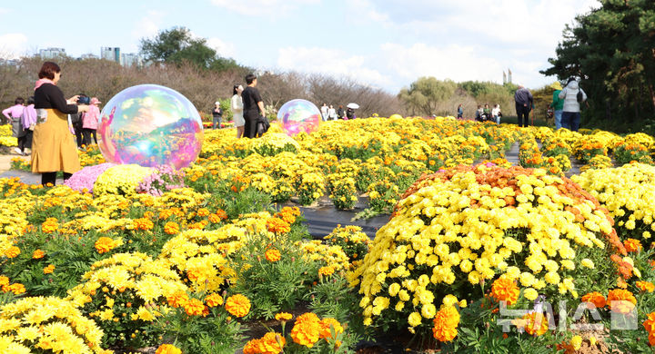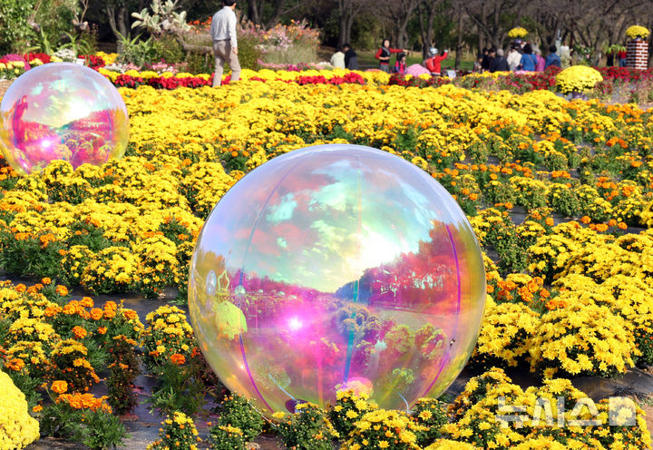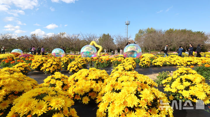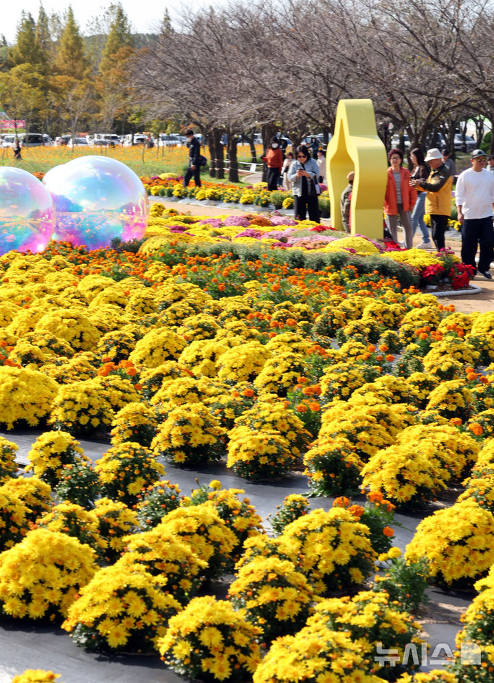 【NEWSIS】菊花芸術祭まであと二日と迫った23日、京畿道水原市霊通区のチソン公園では、色も形もさまざまなキクの花が咲いていた。