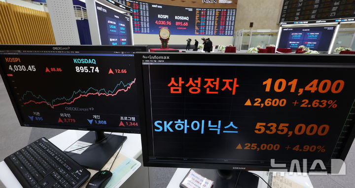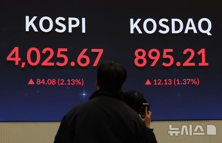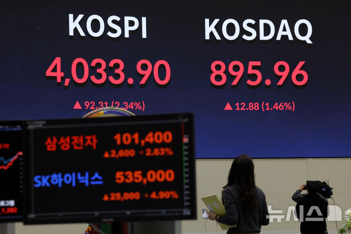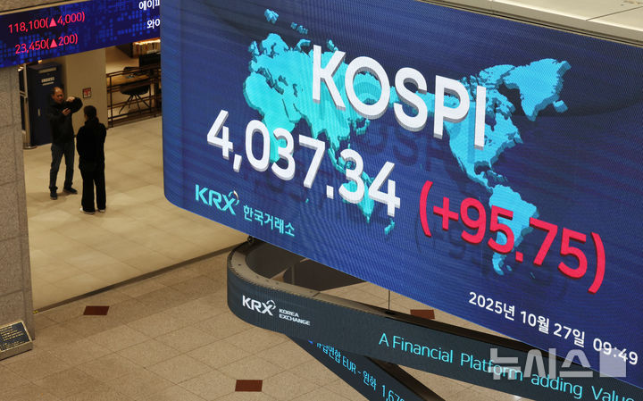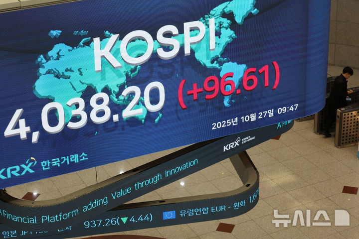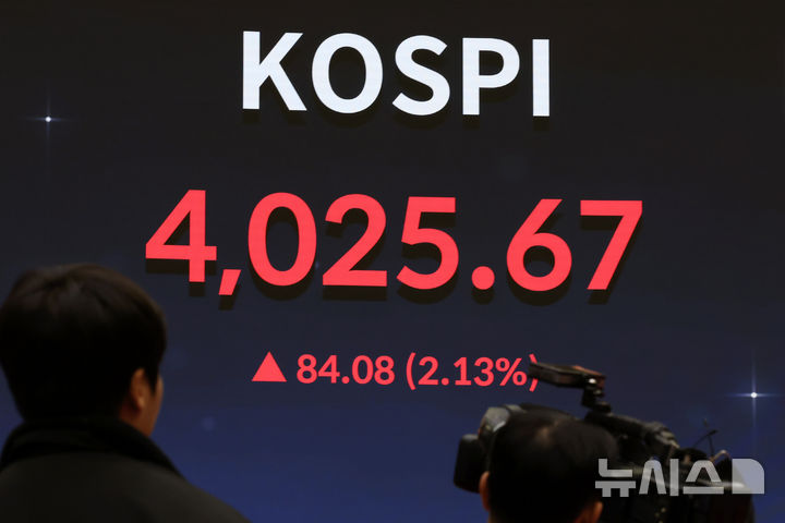【NEWSIS】27日午前の韓国株式市場で、総合株価指数(KOSPI、コスピ)が取引時間中で史上初めて4000ポイントを突破した。写真は同日午前、ソウル市永登浦区の韓国取引所ソウル事務所広報館に表示された指数。