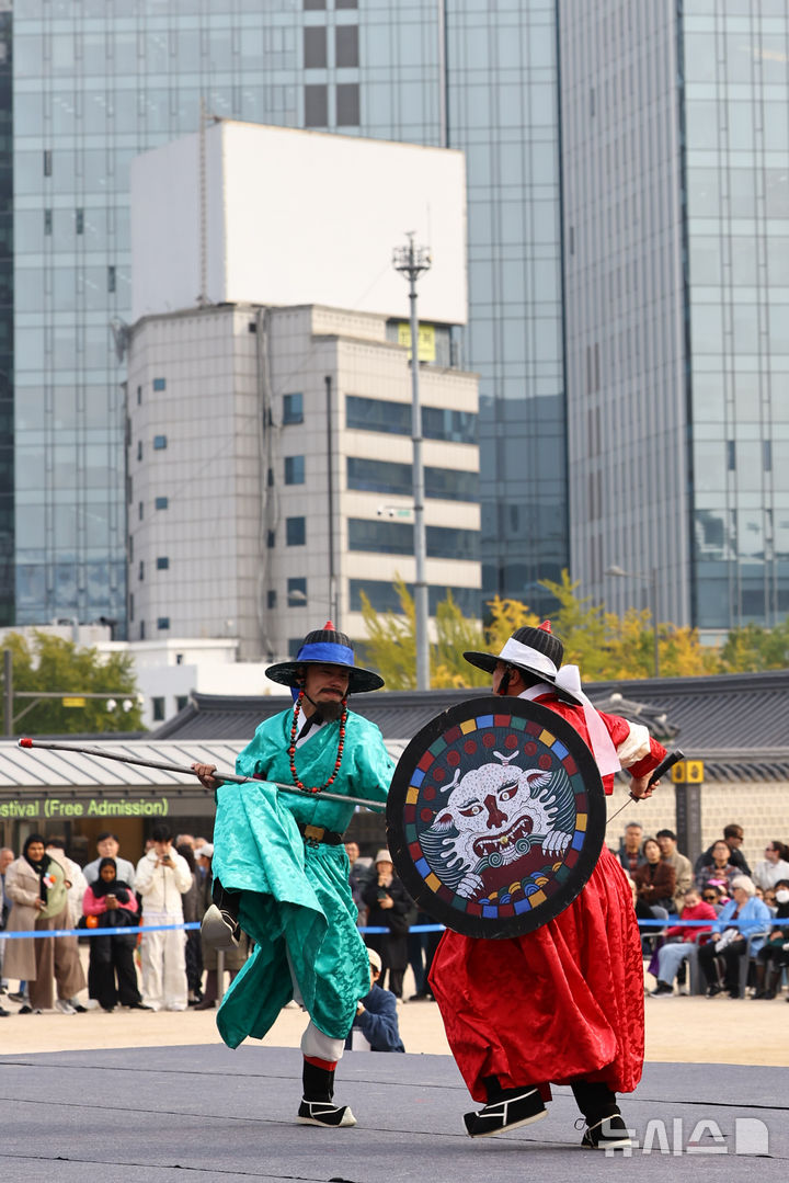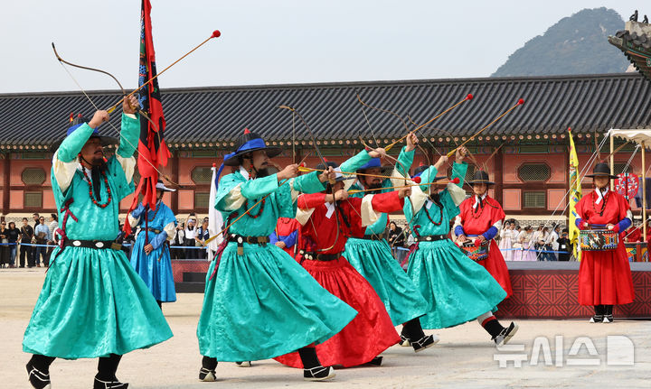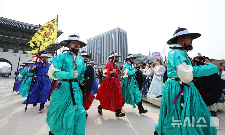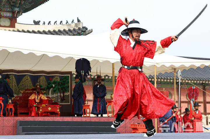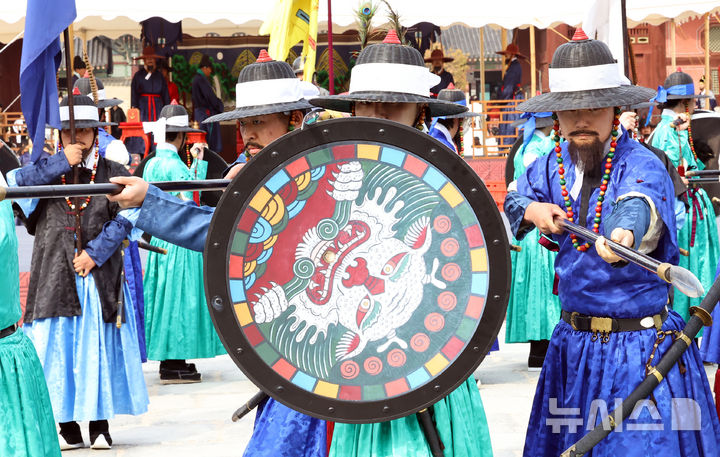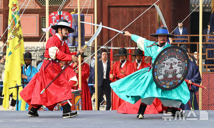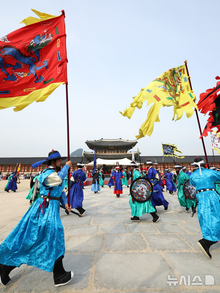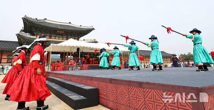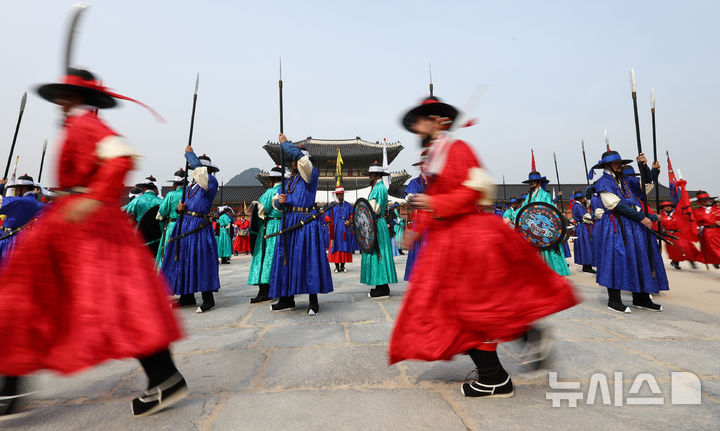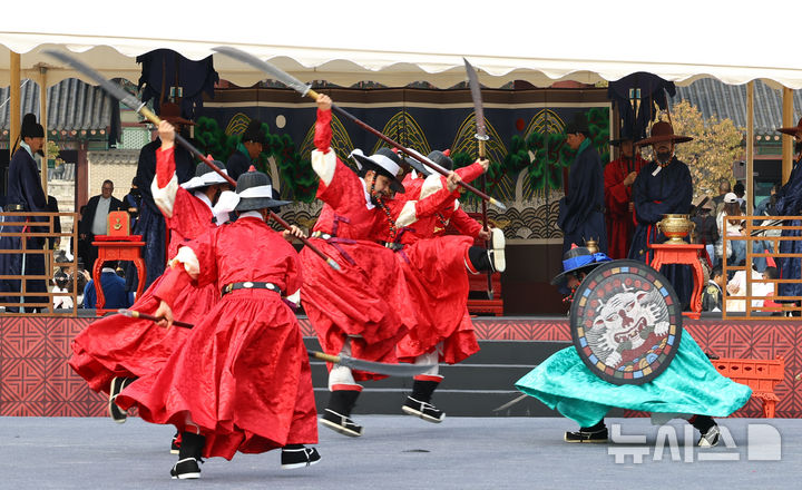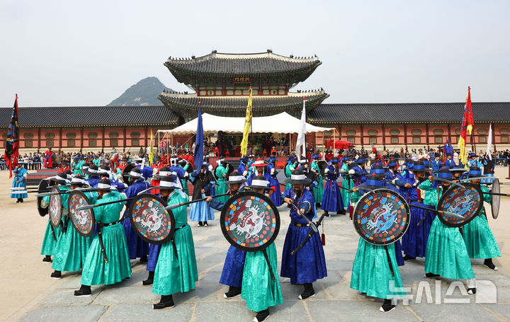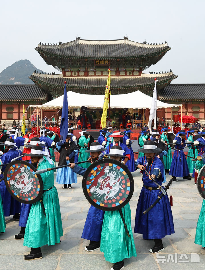 【NEWSIS】30日午後、ソウル市鍾路区の景福宮にある興礼門広場で開かれた「宮闕護衛軍視閲儀式」において、信号体系に基づいた陣法の展示が行われている様子。