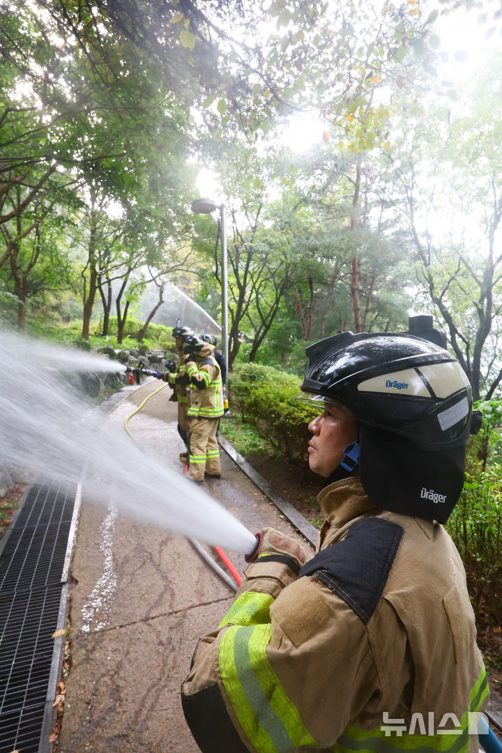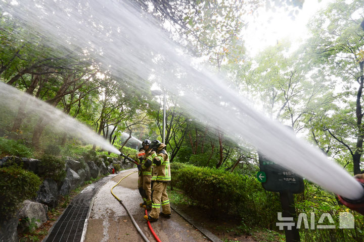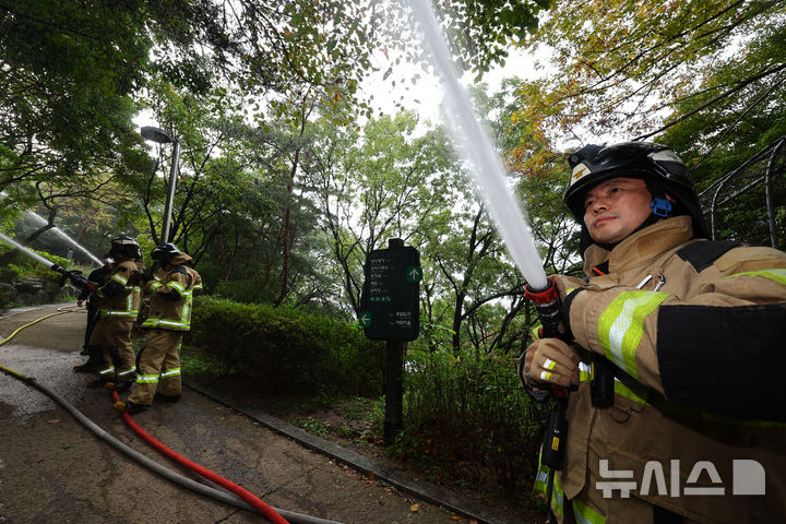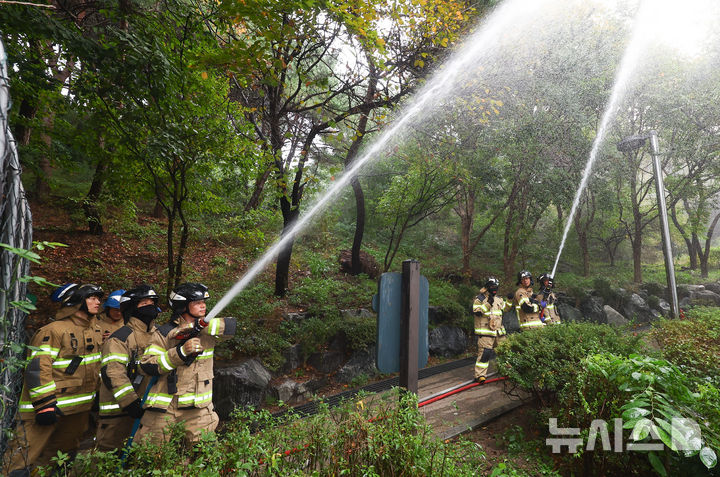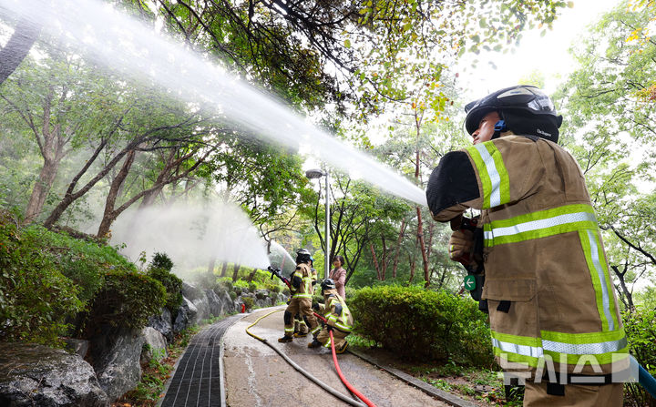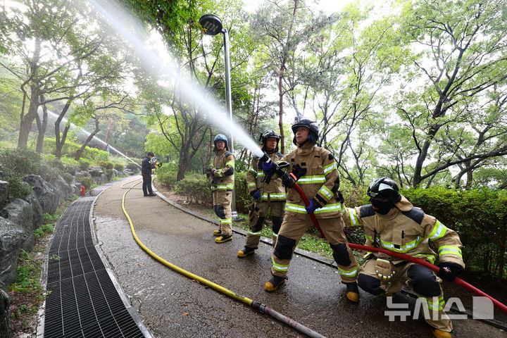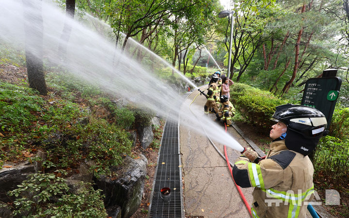 【NEWSIS】ソウル市鍾路区の駱山公園で31日、鍾路消防署の隊員たちが、タバコの火による山火事発生を想定した「山火事発生に伴う災難対応有関期間合同総合訓練」を行っている様子。