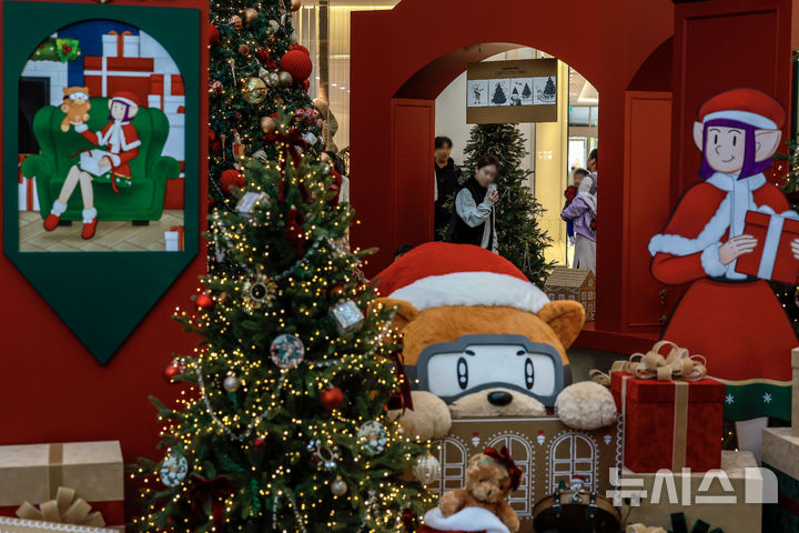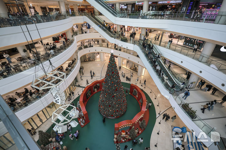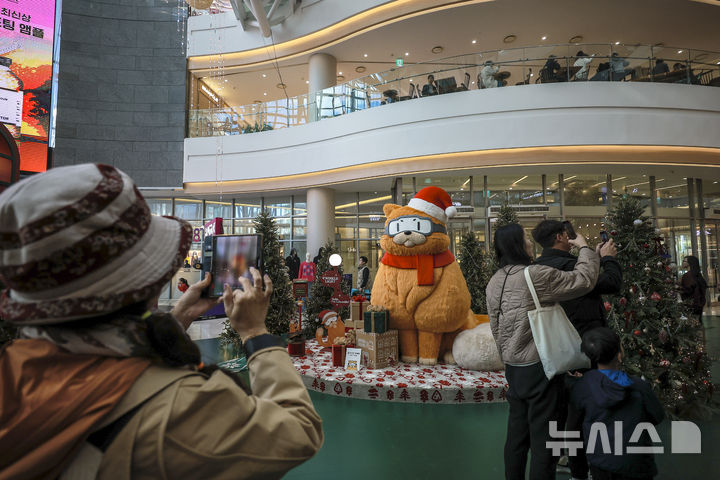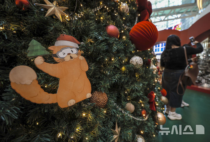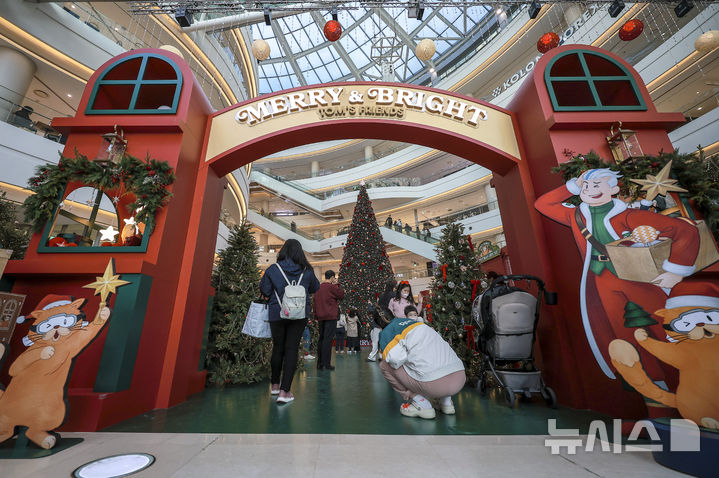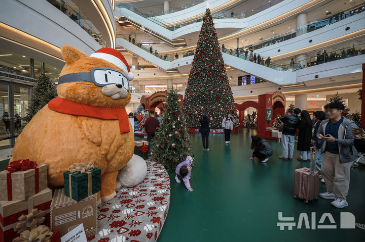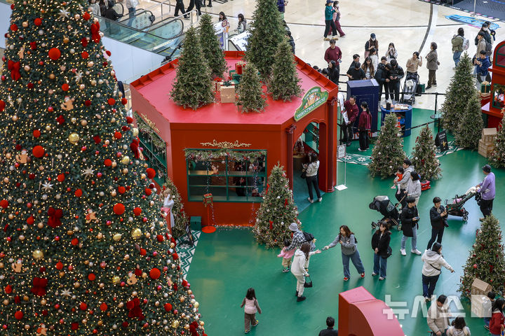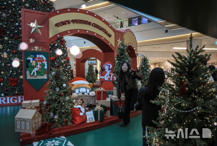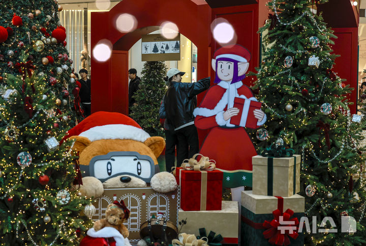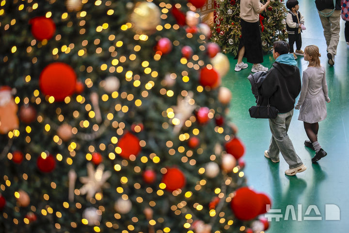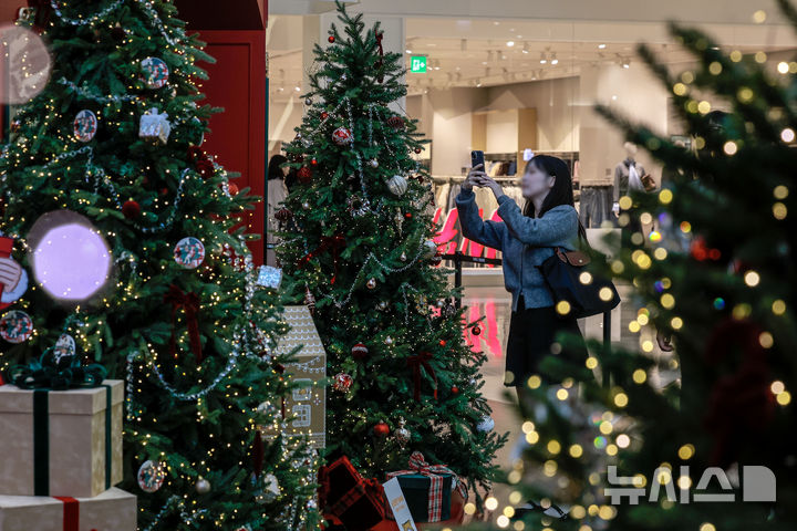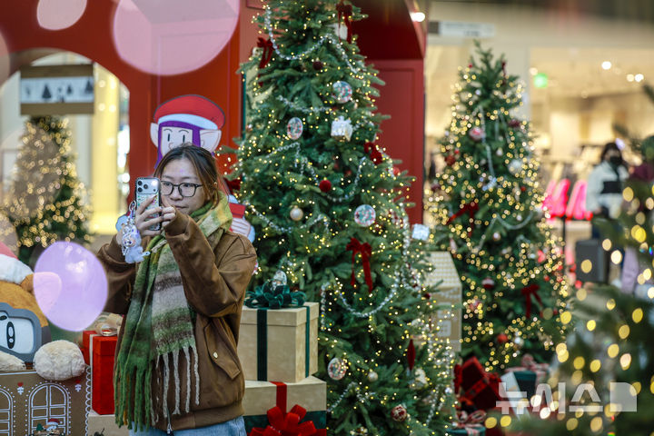 【NEWSIS】2日、ソウル市永登浦区の複合ショッピングモール「タイムスクエア」に特大クリスマスツリーが設置された。写真はクリスマスツリーの前で記念撮影する人々。