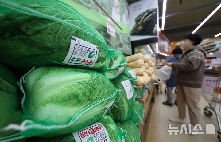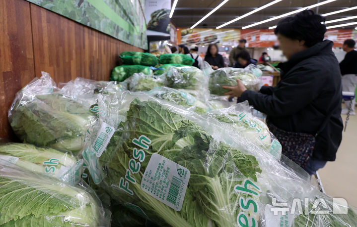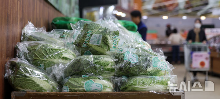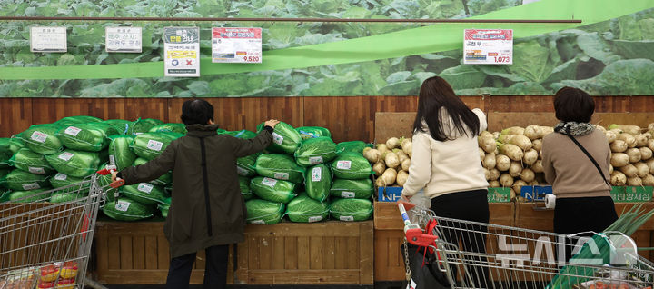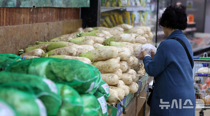大手スーパー基準では47万7750ウォンで、昨年より8.4ポイントのダウンだった。写真は2日、ソウル市内のあるスーパーで、白菜・大根などのキムチ材料が販売されている様子。
