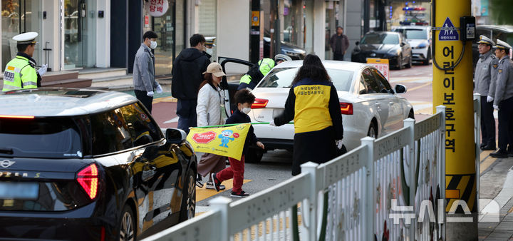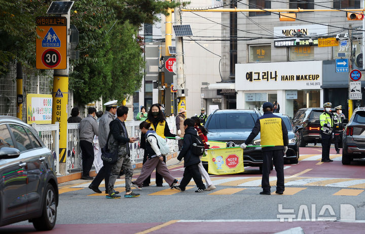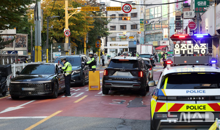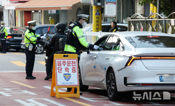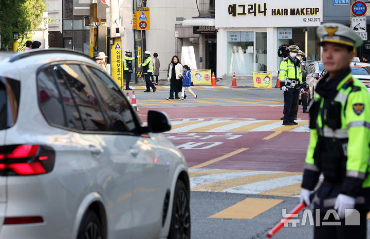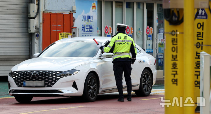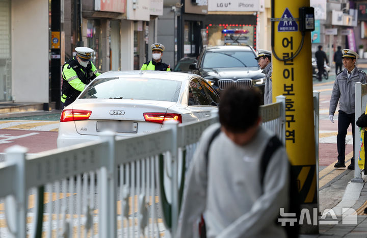 【NEWSIS】4日、ソウル市江南区の論ヒョン小学校近くで、「ソウル交通Re-デザイン・プロジェクト」の「気持ちすっきり交通取り締まり」が行われた。写真は児童保護区域周辺の飲酒運転や停止線違反などを取り締まる警察官たち。