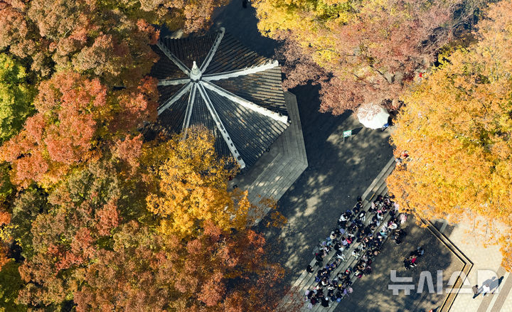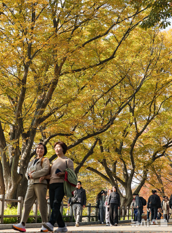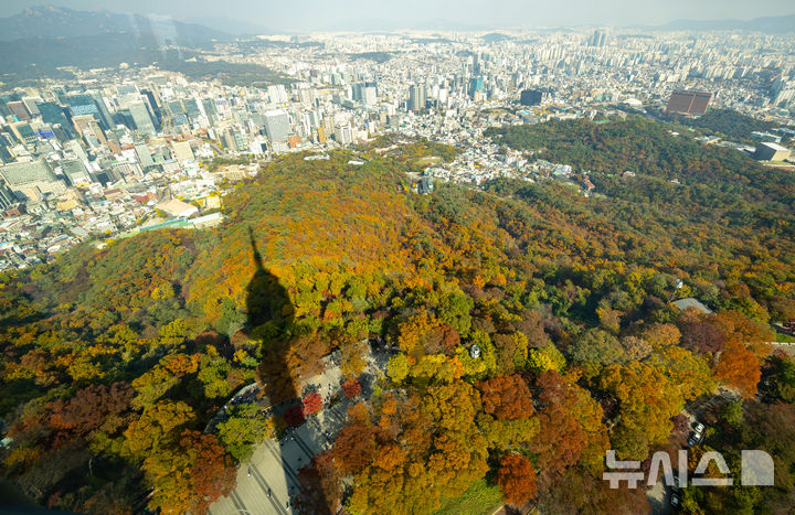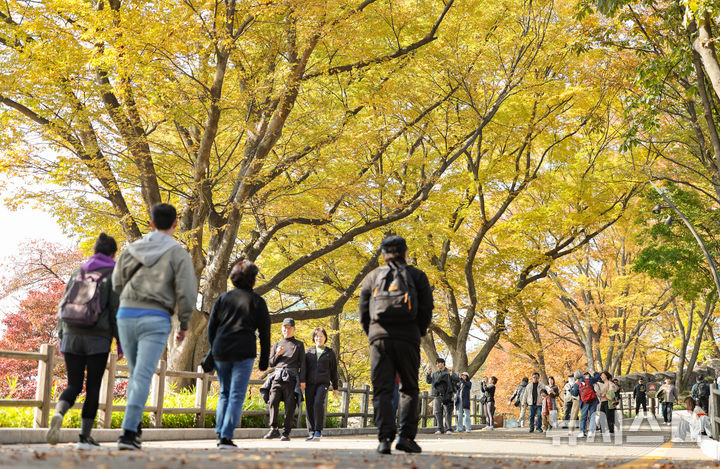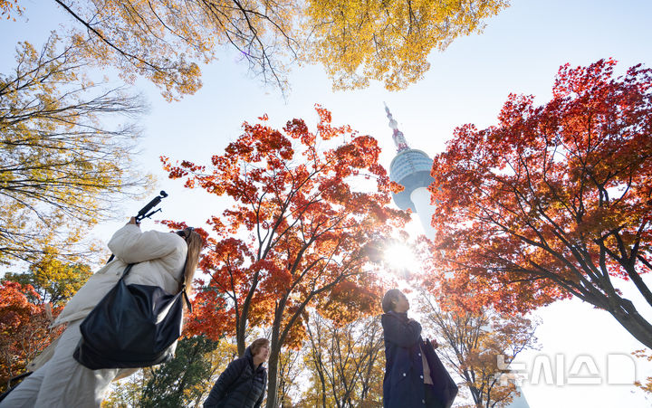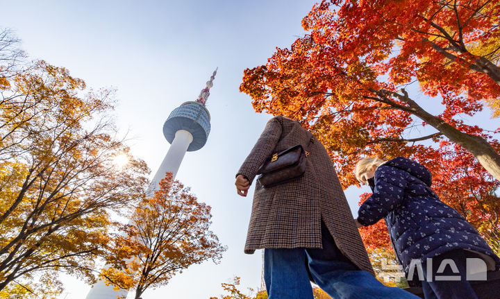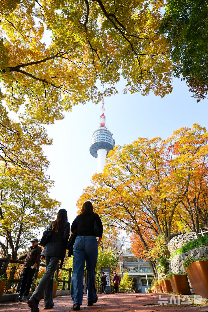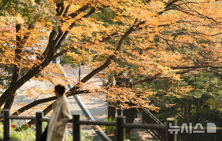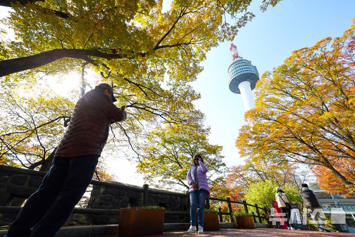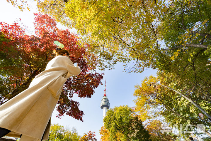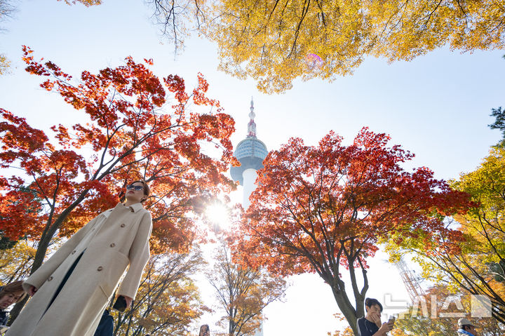 【NEWSIS】はっきりと秋らしい天気になった4日、ソウル市中区の南山を訪れた市民が紅葉の道を歩いている様子。