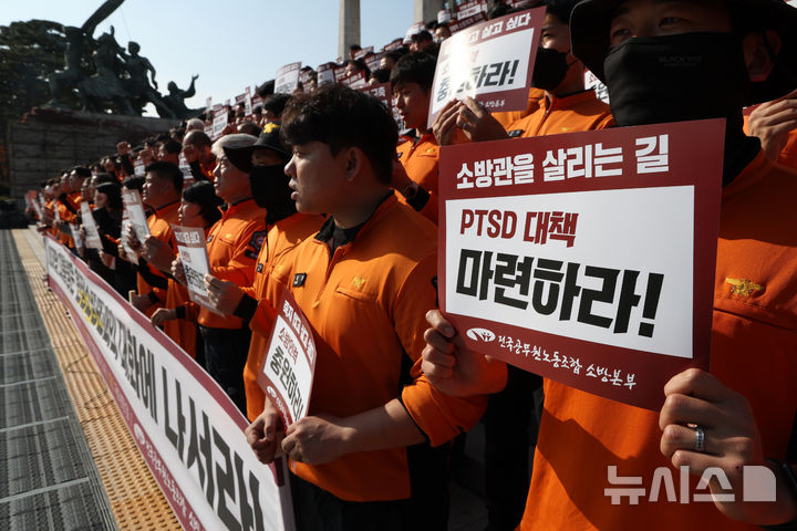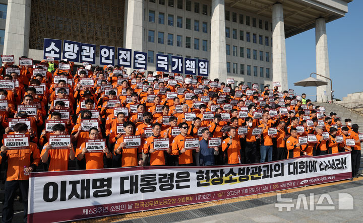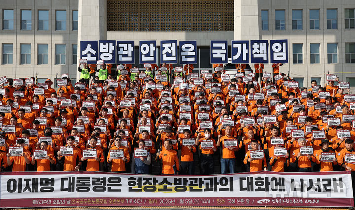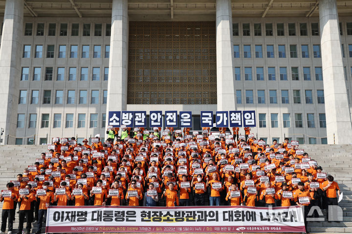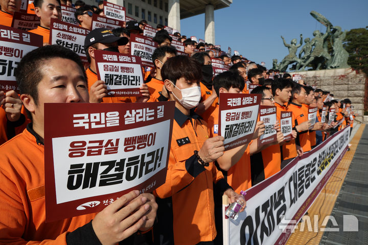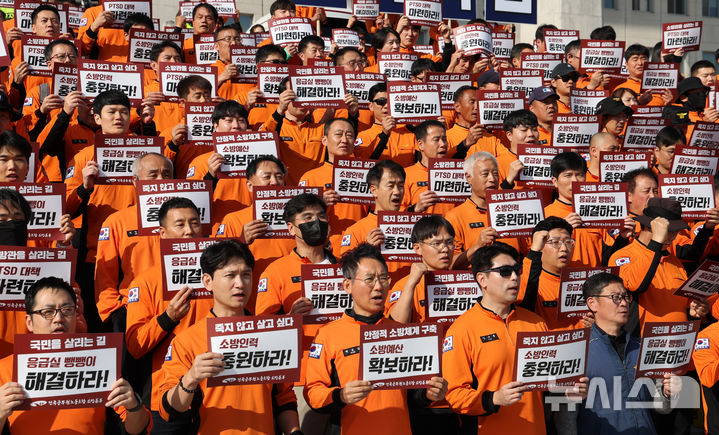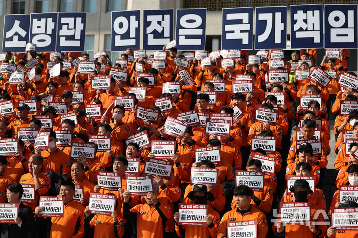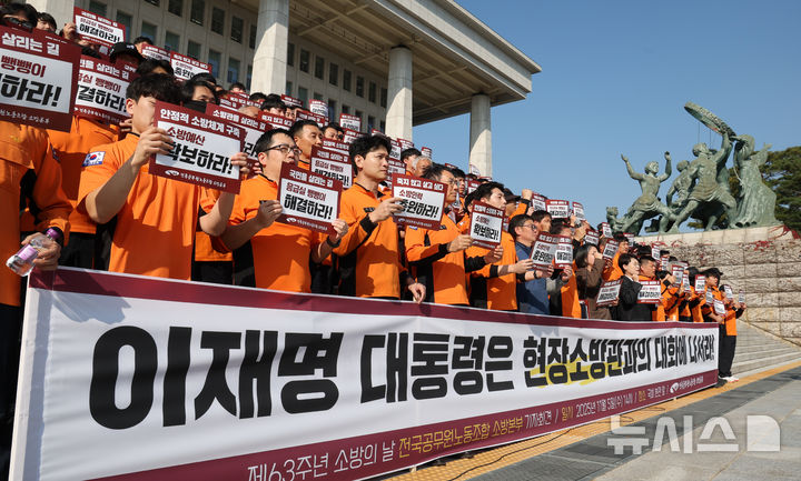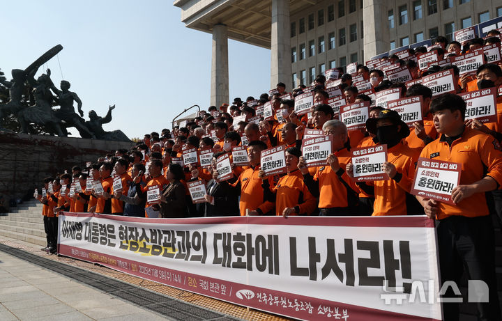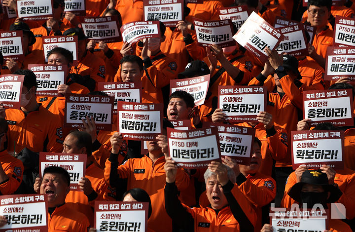 【NEWSIS】全国公務員労働組合消防本部組合員たちが5日午後、ソウル市汝矣島の韓国国会本庁前の階段で「消防の日」63周年記者会見を開いた後、スローガンを叫んでいる様子。
