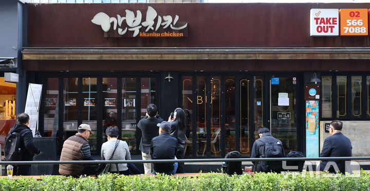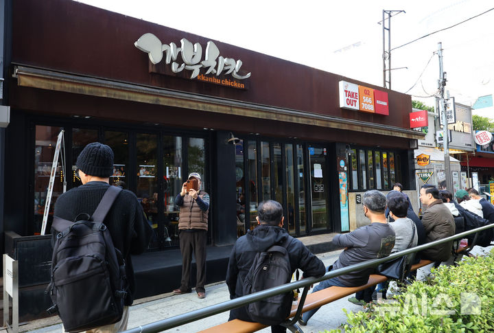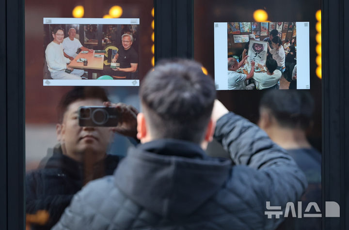 【NEWSIS】NVIDIA(エヌビディア)のジェンスン・フアン最高経営責任者(CEO)、サムスン電子の李在鎔(イ・ジェヨン)会長、現代自動車グループの鄭義宣(チョン・ウィソン)会長が「チメク(チキンとビール)会合」をしたソウル市江南区の「カンブ・チキン」三成店で5日、開店前から行列をする人々。