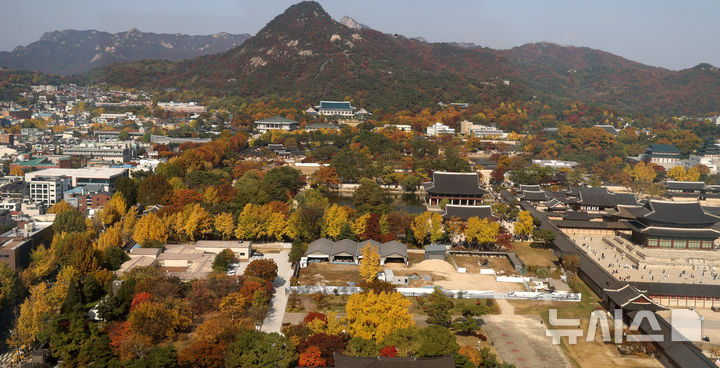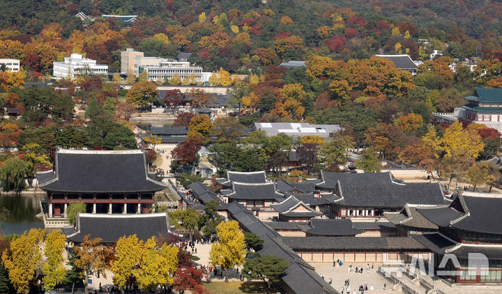 【NEWSIS】秋晴れとなった9日午後、ソウル市鍾路区の景福宮が色とりどりの紅葉に囲まれていた。