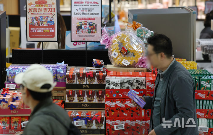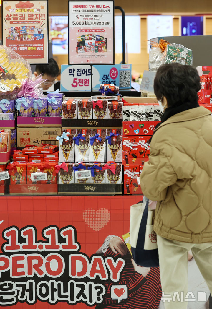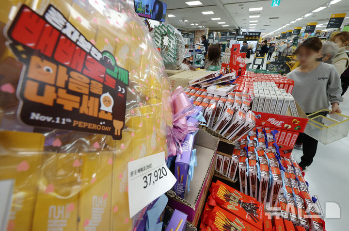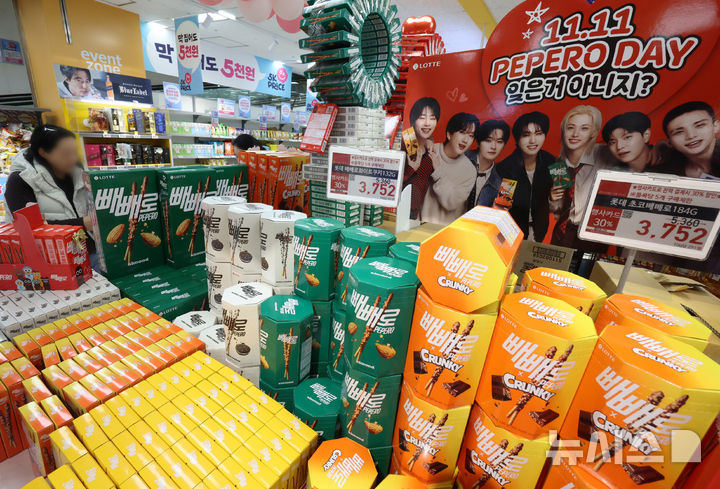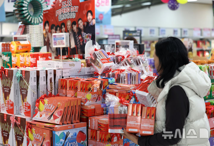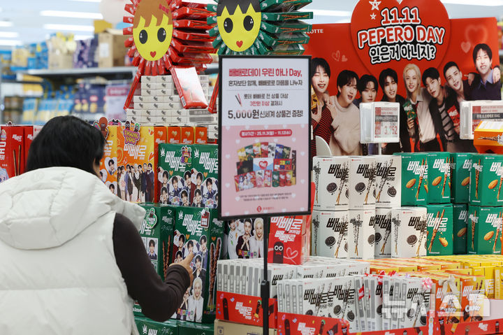 【NEWSIS】ペペロ(韓国版ポッキー)を親しい人に贈る「ペペロデー」まであと一日に迫った10日、ソウル市内の大手スーパーで、ペペロの製品を見て回る市民の様子。