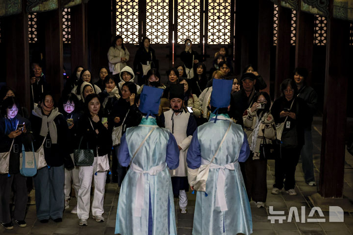【NEWSIS】10日、ソウル市鍾路区の昌慶宮で、2025夜間観覧「同闕同楽」が開催された。写真は「没入型ガイドツアー」に参加して宮殿を見学する入場者たち。