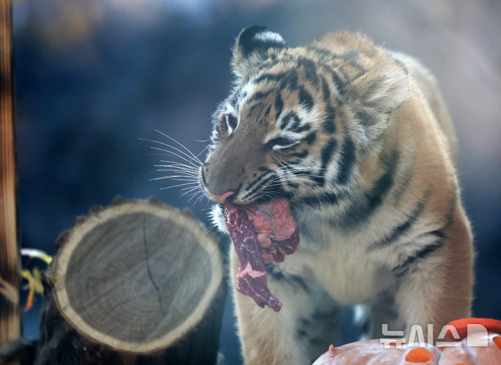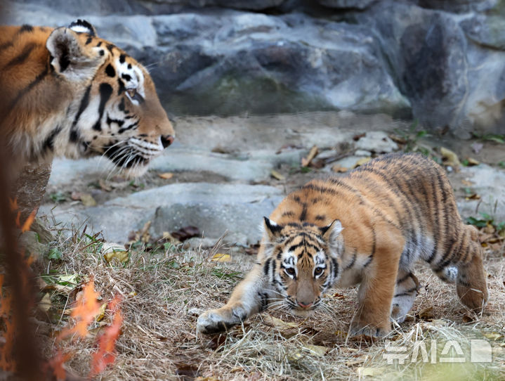 【NEWSIS】アムールトラの子、「雪虎」が11日午前、京畿道果川市にあるソウル動物園猛獣舎のトラ放飼場(飼育場)で悠々と歩いている様子。純粋血統のアムールトラ「雪虎」は、顕忠日にソウル大公園で生まれた。