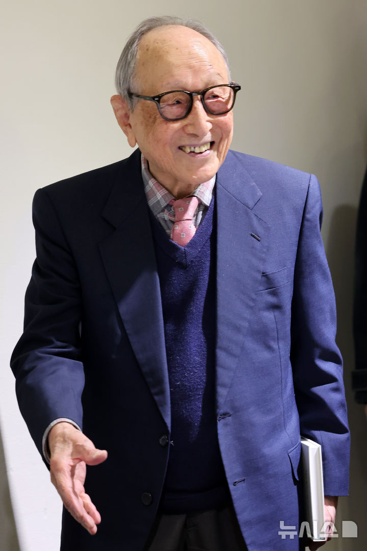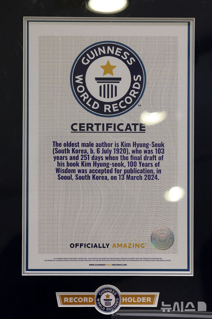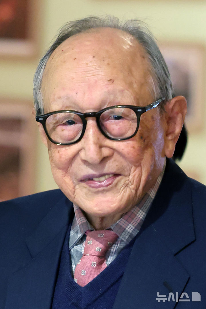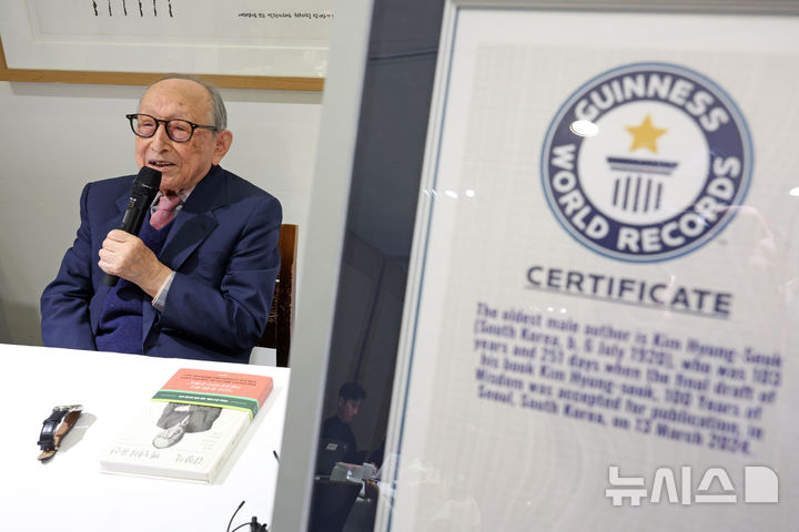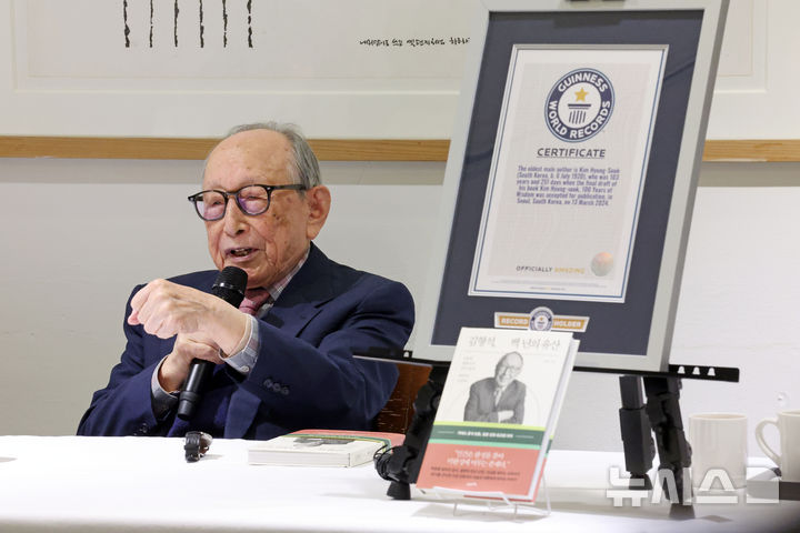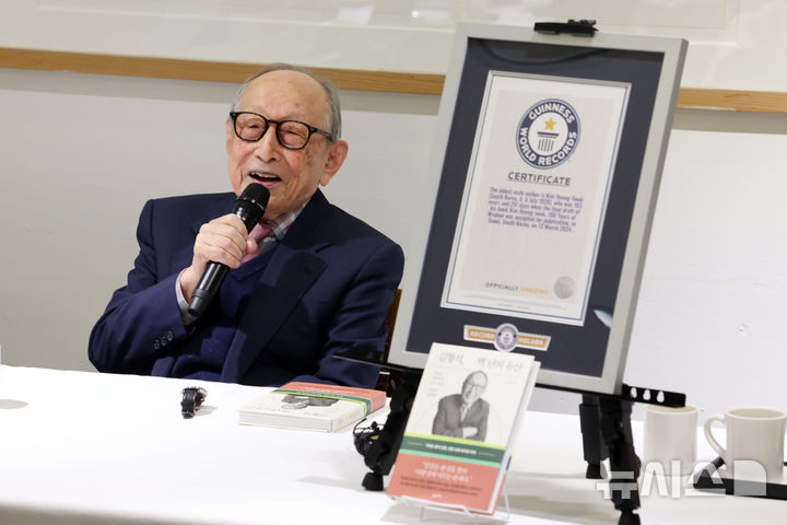 【NEWSIS】ギネスブックに認定された「世界最高齢の著者」、金亨錫(キム・ヒョンソク)延世大学名誉教授が12日、ソウル市中区の「タルゲビ(ツユクサ)」で著書『金亨錫、百年の遺産』出版記者懇談会を開いた。2024年に金名誉教授は、著書『百年の知恵』でギネスブックの「世界最高齢の著者」認定を受けた。