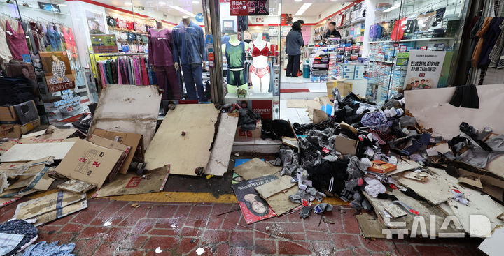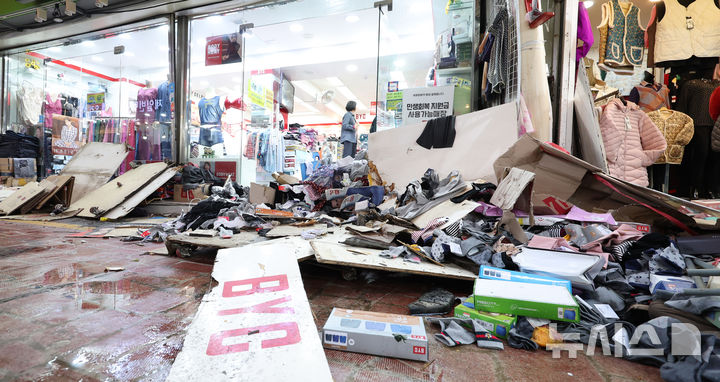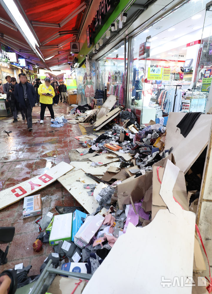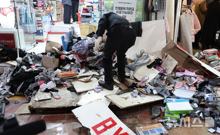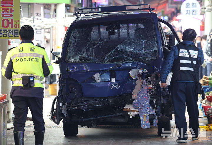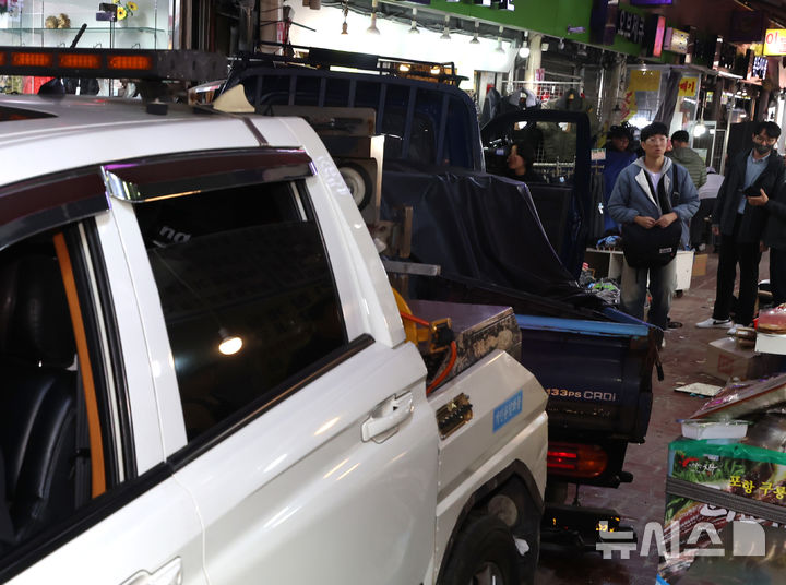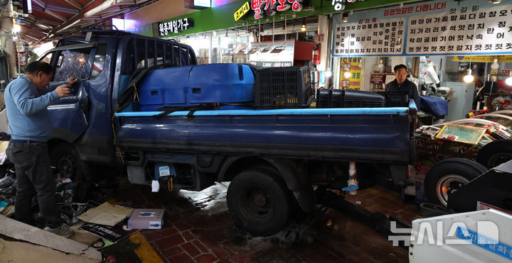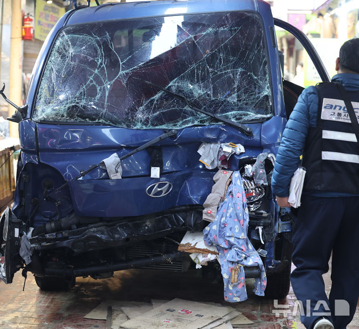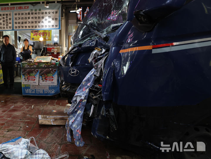 【NEWSIS】京畿道富川市梧亭区遠宗洞の「第一市場」で13日午前、走行中のトラックが商店に突っ込み、およそ20人の死傷者が発生した。写真は事故を起こしたトラックがけん引されている様子。