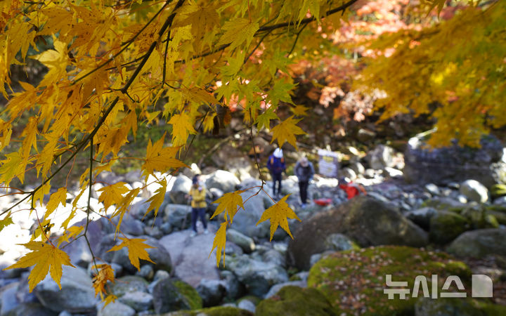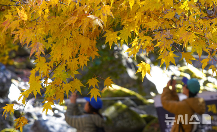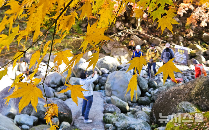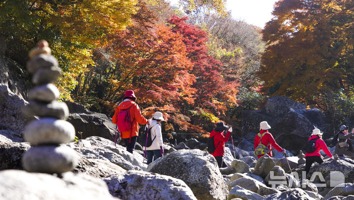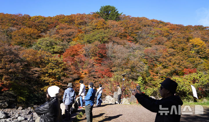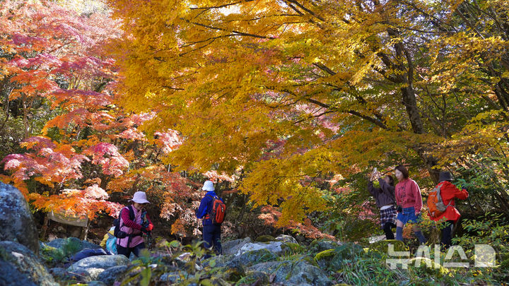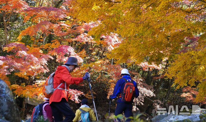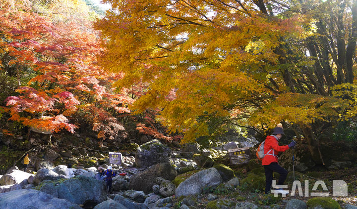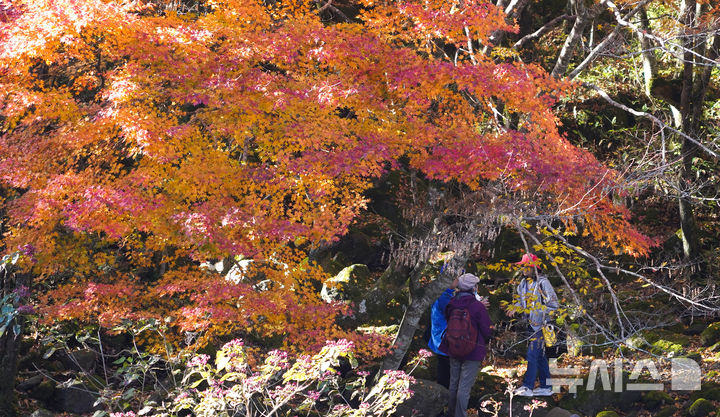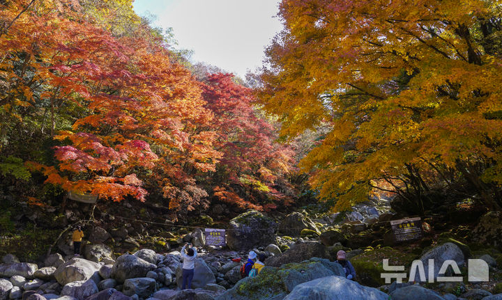 【NEWSIS】晴天となった14日午前、済州島・漢拏山の天娥渓谷では、訪れた人々が色とりどりの紅葉を鑑賞しつつ晩秋の趣きを満喫していた。