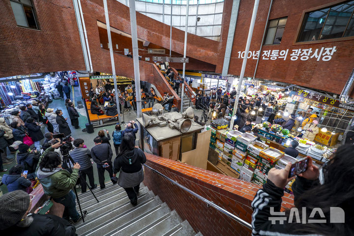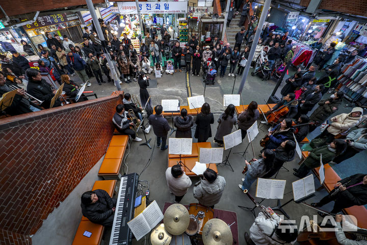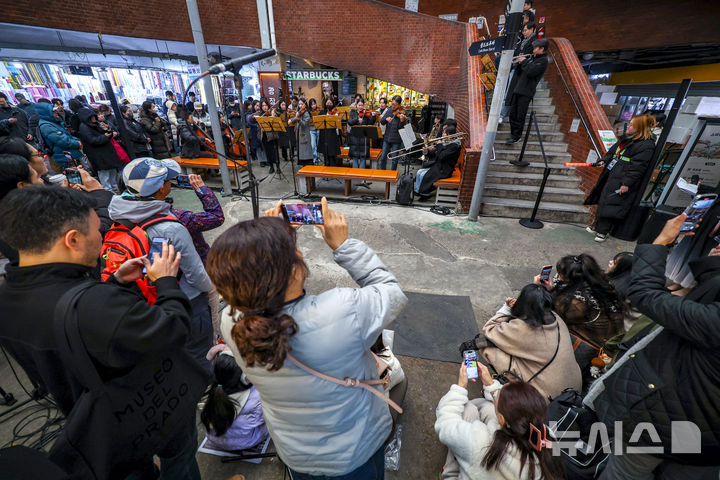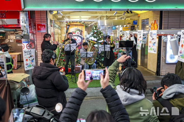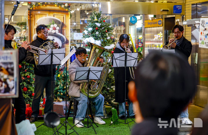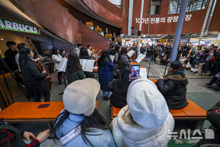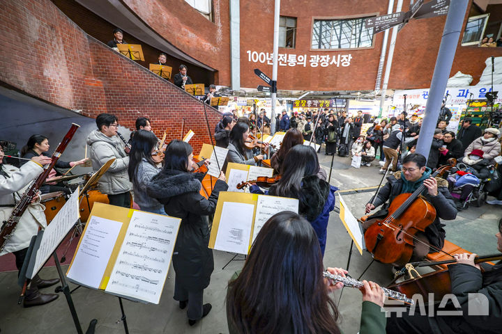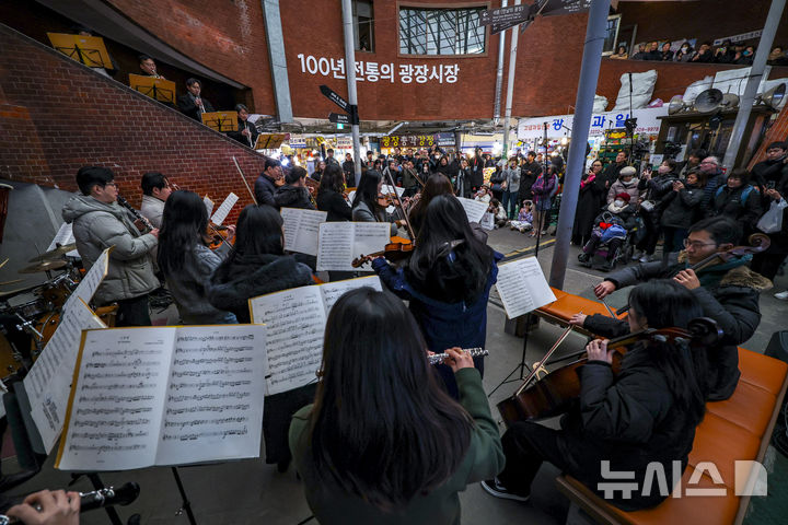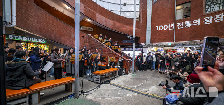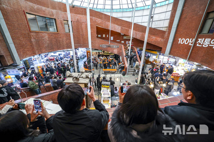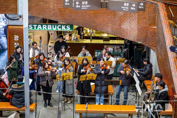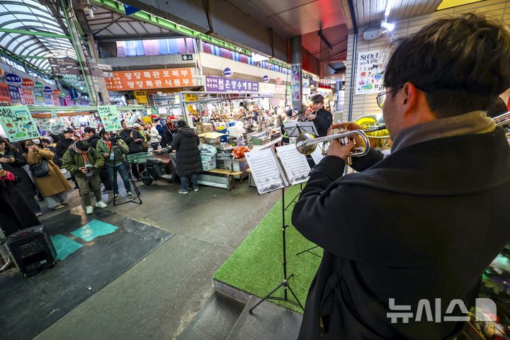 【NEWSIS】18日、ソウル市中区の広蔵市場で開かれた「2025 seoul vibe」で、演奏者たちがK-POPの楽曲公演を行っているところ。