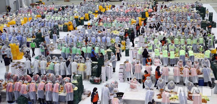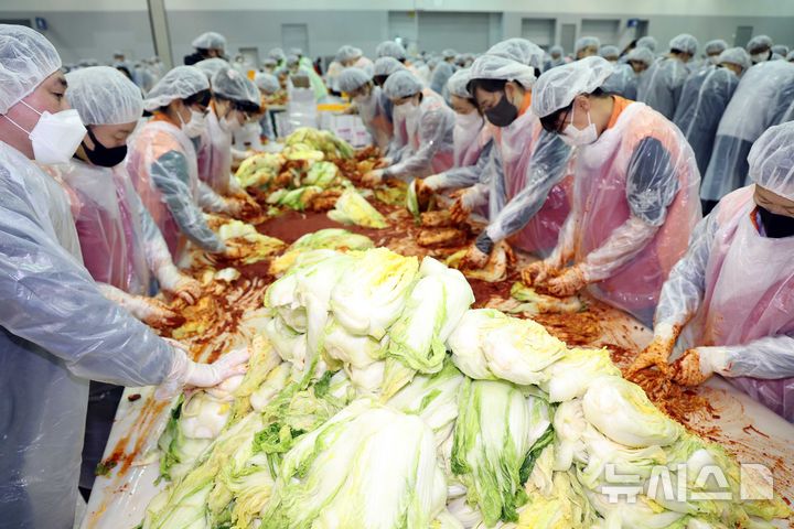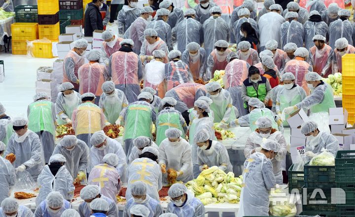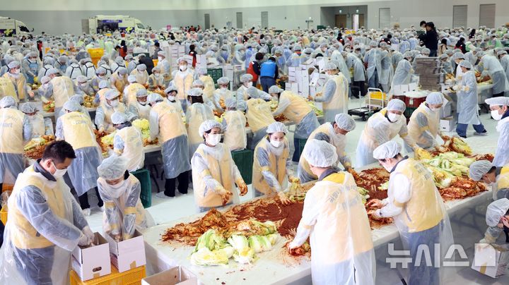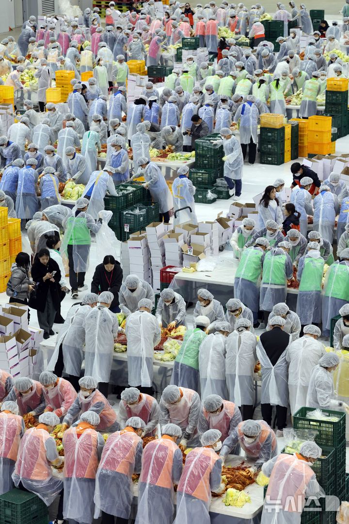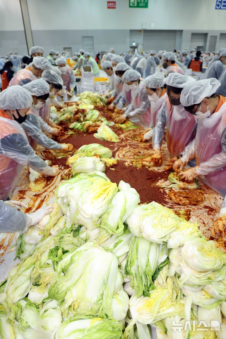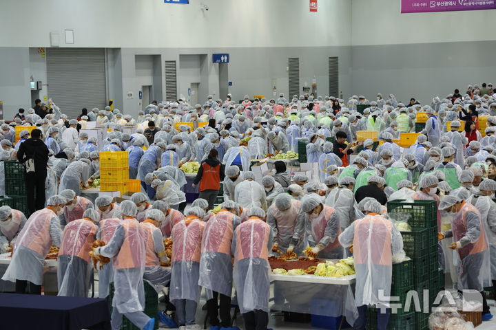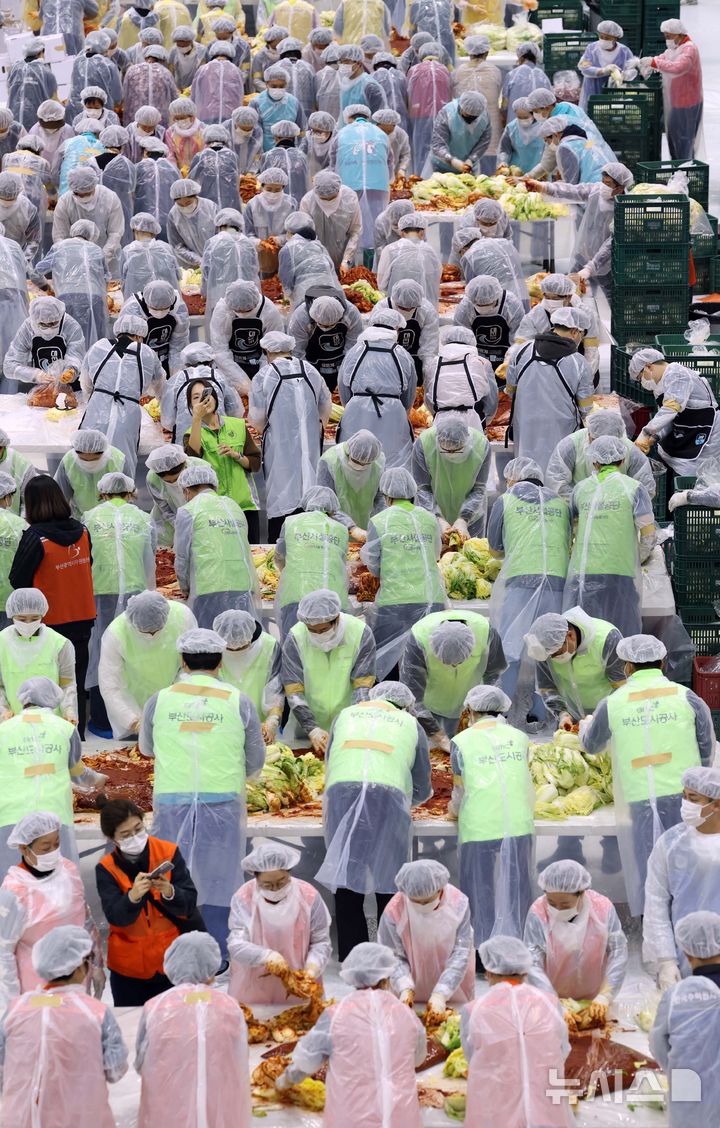【NEWSIS】「2025愛のキムチ分かち合い広場」が開催された19日、釜山市海雲台区のBEXCO第2展示場で、40に上る後援企業・機関の関係者およびボランティアなどおよそ1000人が、漬物にするハクサイをヤンニョムと和えている様子。