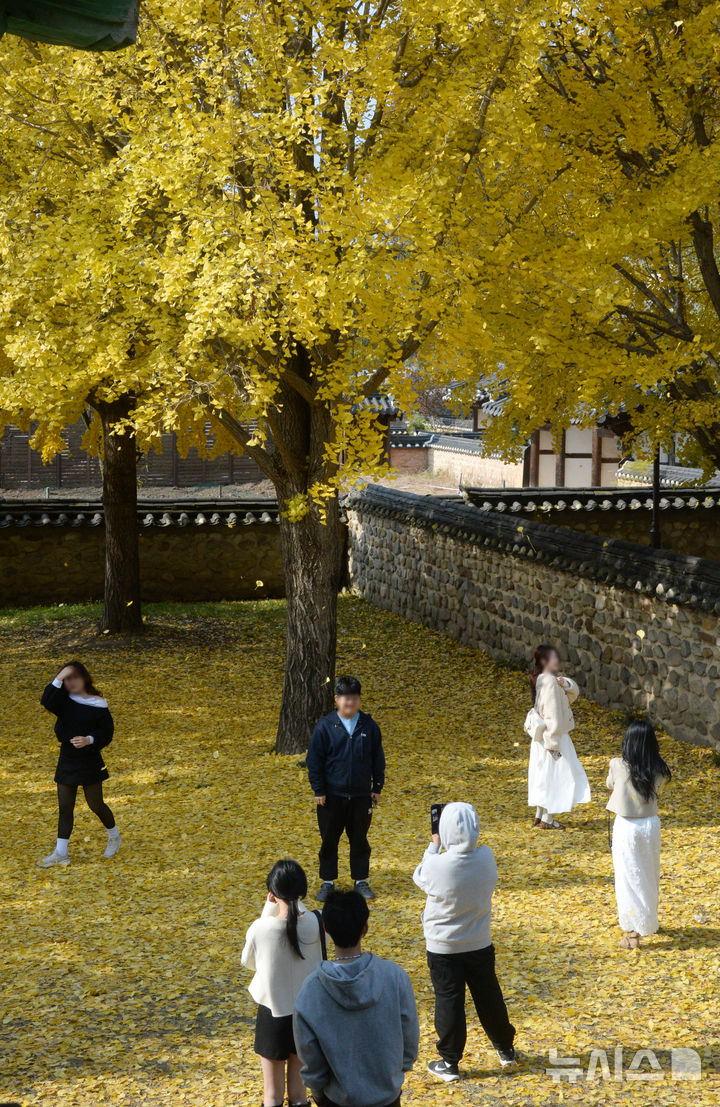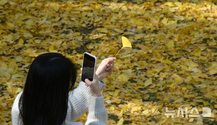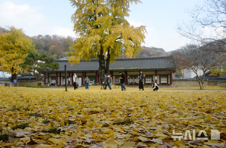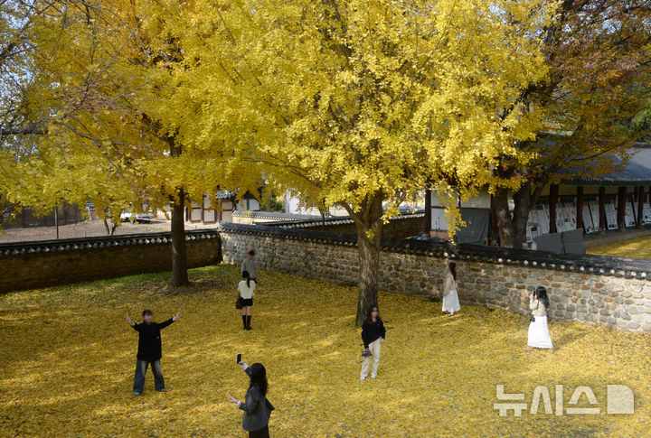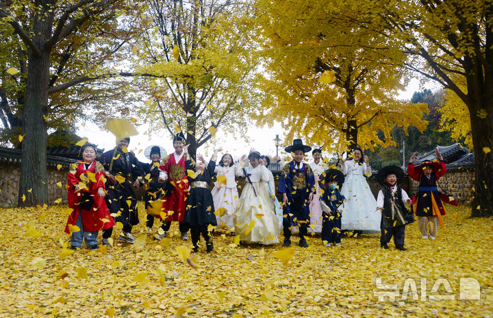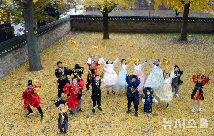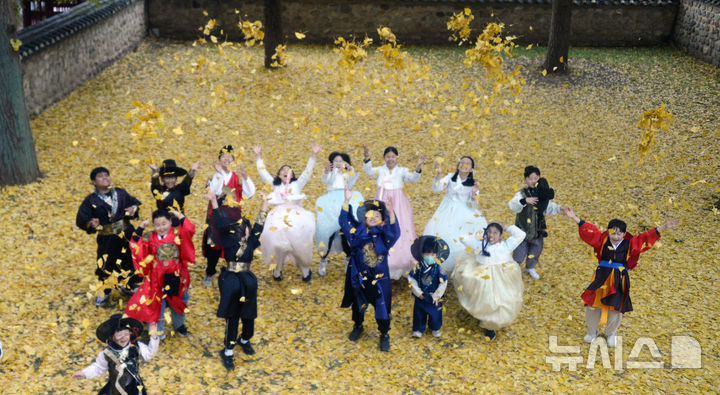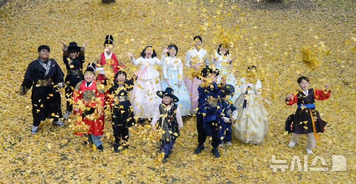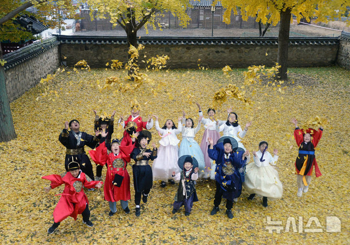 【NEWSIS】秋も盛りの天気が続いている20日、全羅北道全州市の全州郷校では、金堤・竜洞小学校の児童が落ち葉を投げて秋を満喫していた。