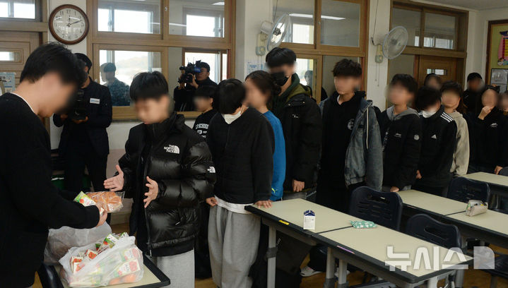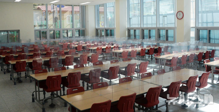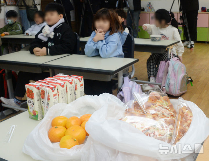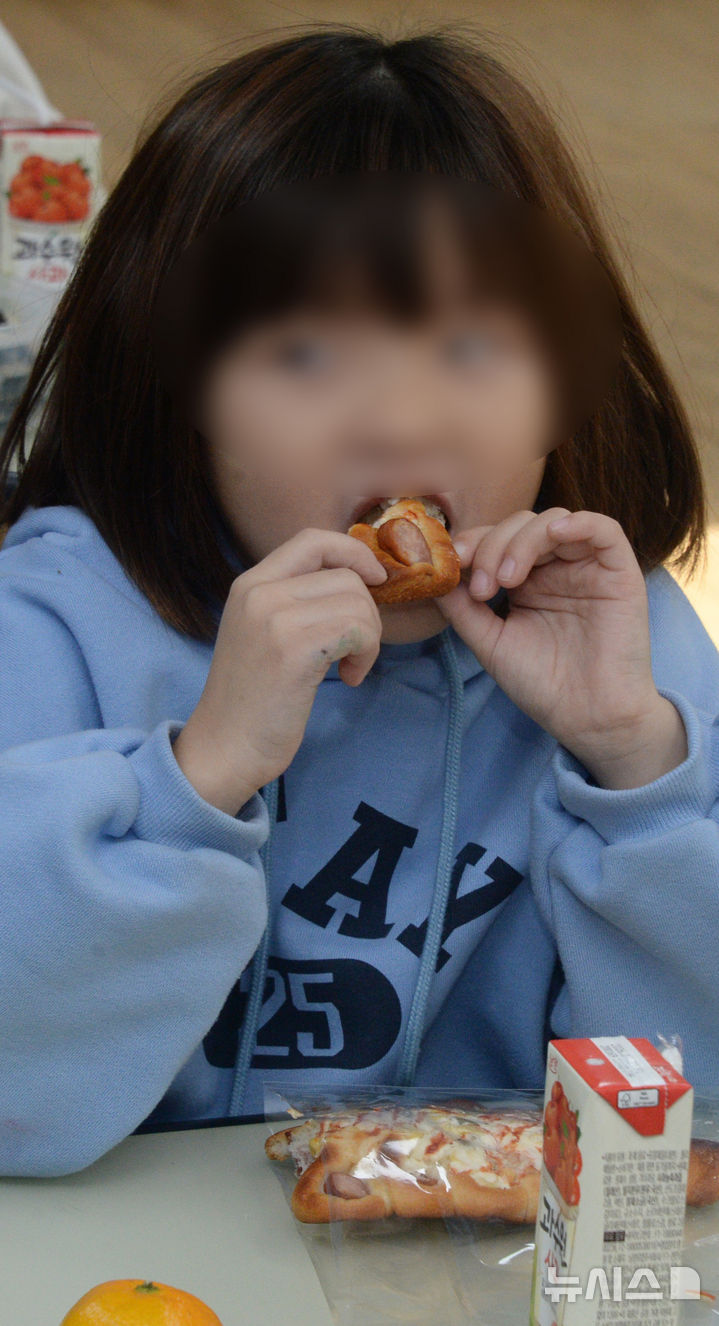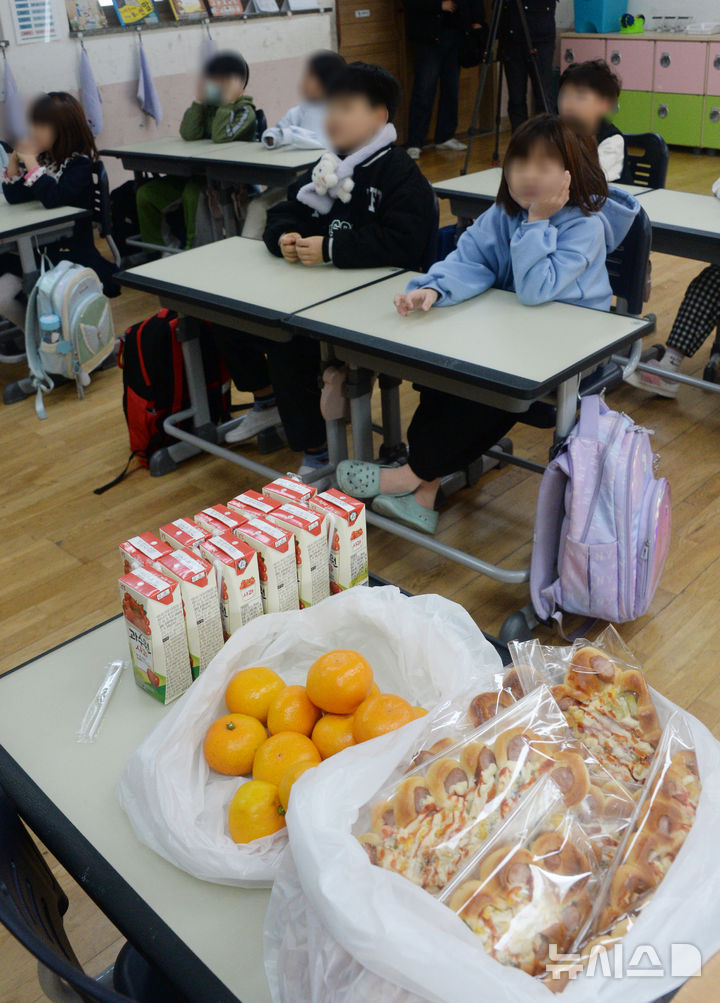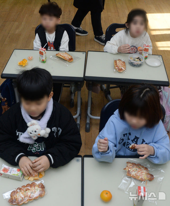 【NEWSIS】給食・ケアなどを担当する全国学校非正規職連帯会議がリレー全面ストライキに突入した21日、全羅北道全州市完山区の小学校で、パンと飲み物の「代替給食」を食べる児童の様子。