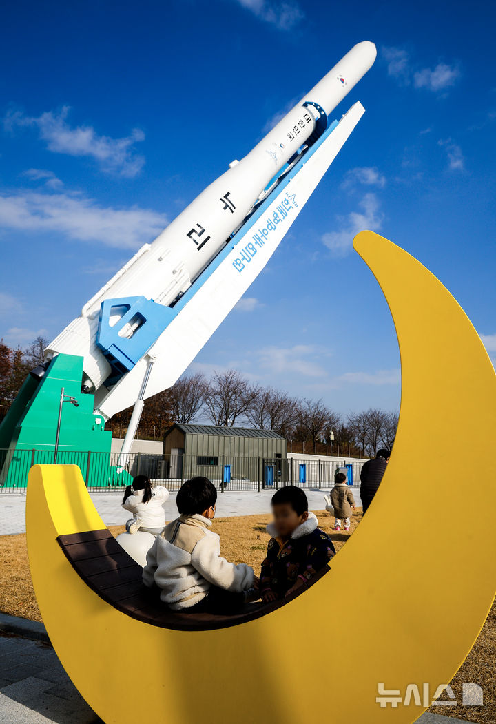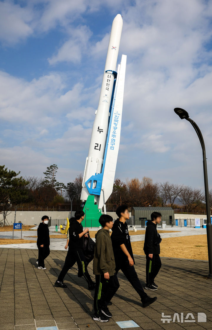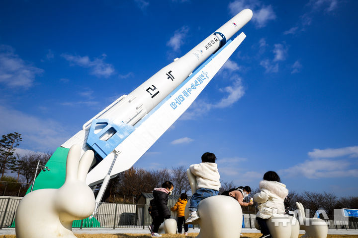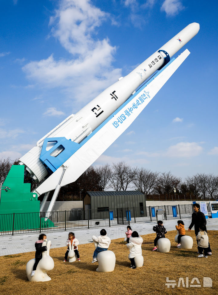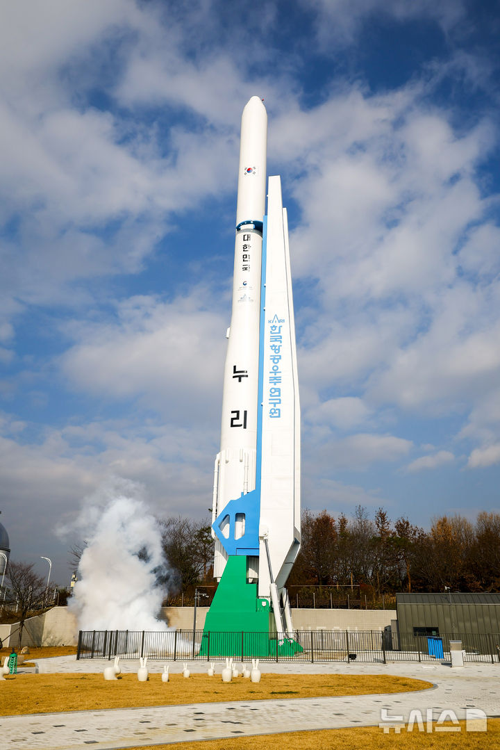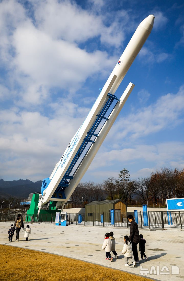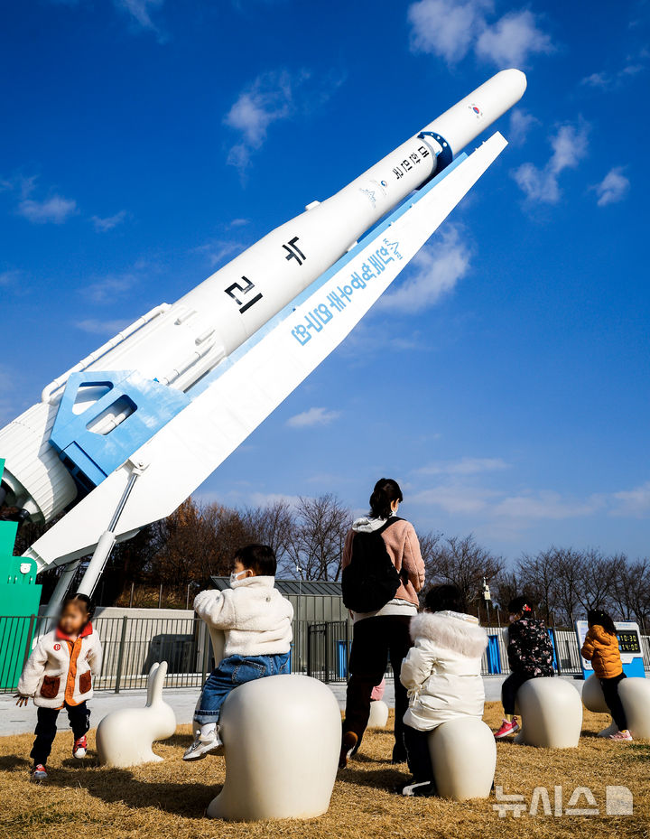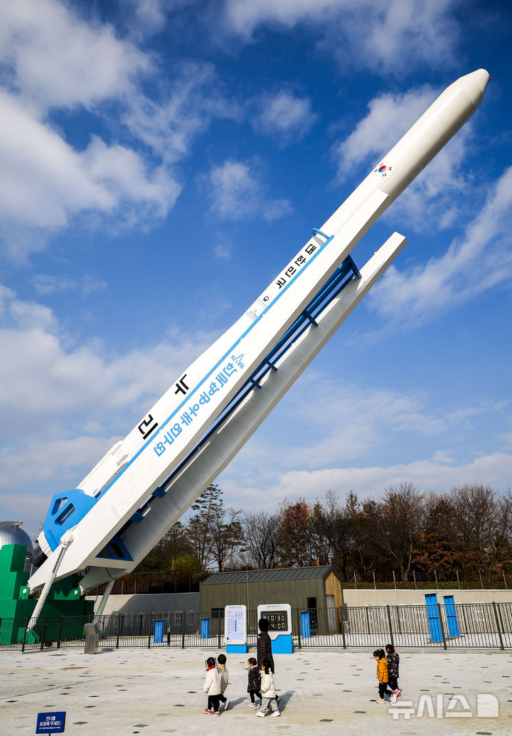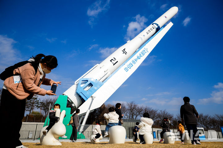 【NEWSIS】宇宙ロケット「ヌリ号」の4回目の打ち上げがあすに迫った26日、京畿道果川市の国立果川科学館を訪れた人々が、模型ヌリ号の起立の様子を眺めているところ。民間企業のハンファ・エアロスペースが技術移転を通してロケット製造の全ての過程を主管しているヌリ号は、オーロラ・大気光観測や宇宙磁場・プラズマ測定のための衛星13基を搭載し、27日午前1時ごろ打ち上げられる予定だ。
