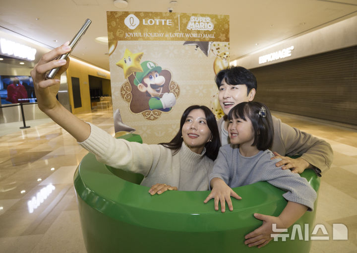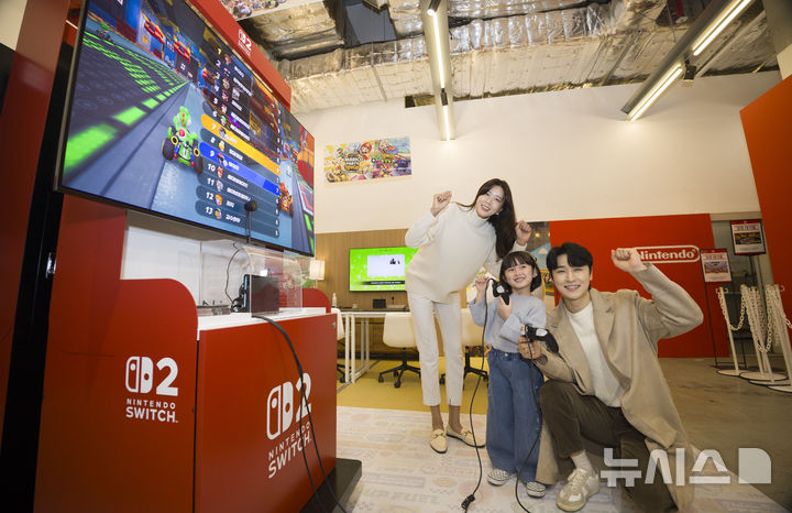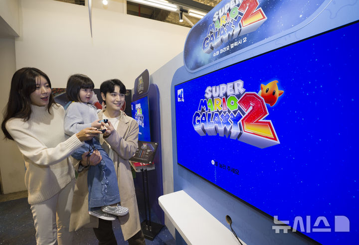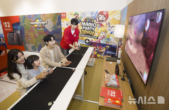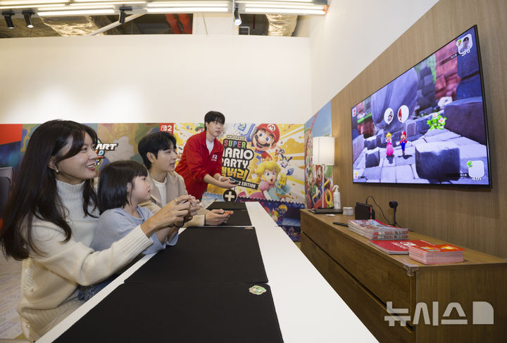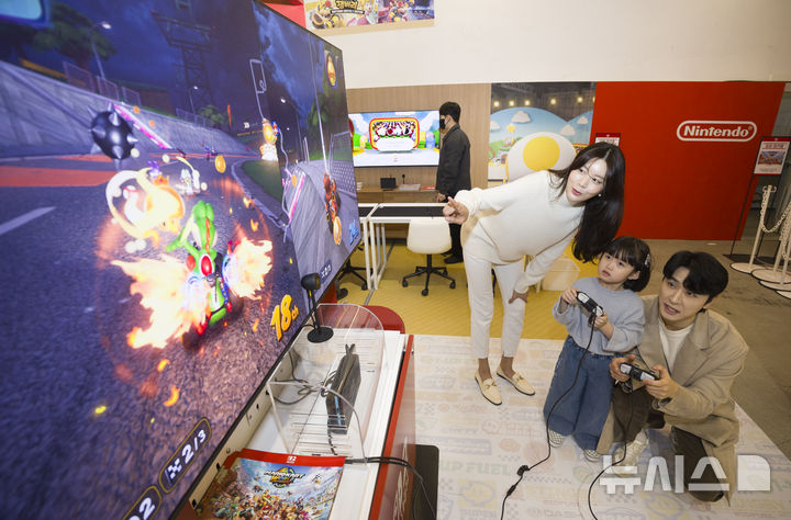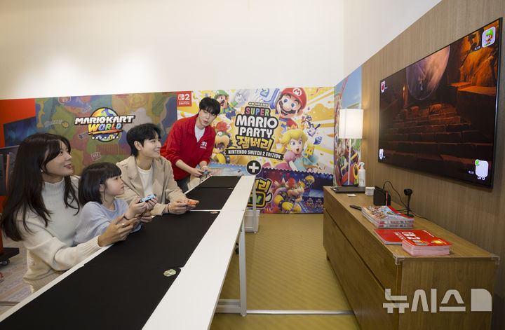 【NEWSIS】27日、ソウル市松坡区の蚕室ロッテワールドモールにオープンした任天堂のポップアップストア「Nintendo POP-UP STORE in SEOUL」で、ゲームを体験しているコンパニオンの様子。