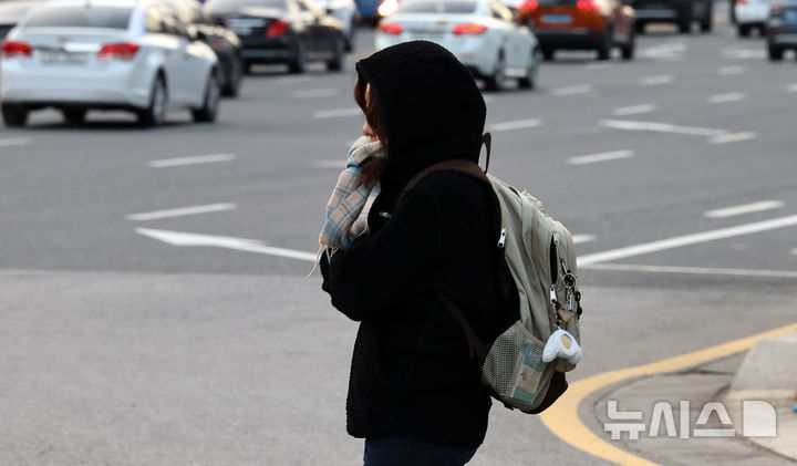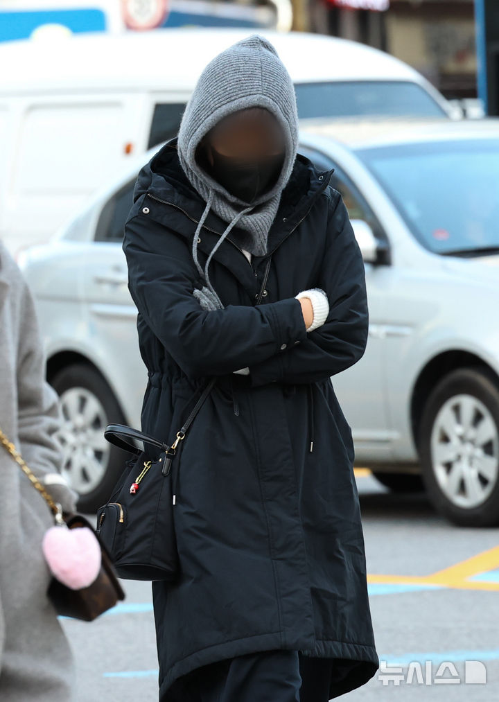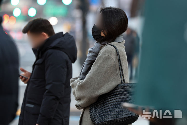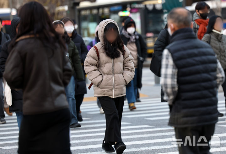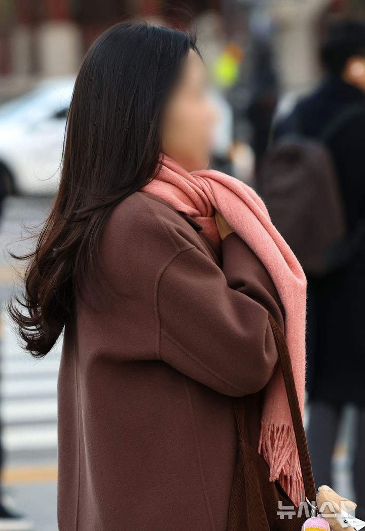 【NEWSIS】韓国の全国ほとんどの地域の朝の気温が氷点下に達した2日、ソウル市鍾路区の世宗大路交差点で、寒さで縮こまるように体を丸めて出勤する人。