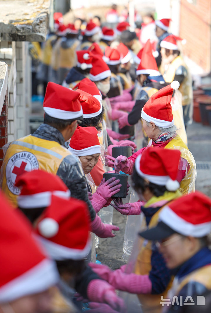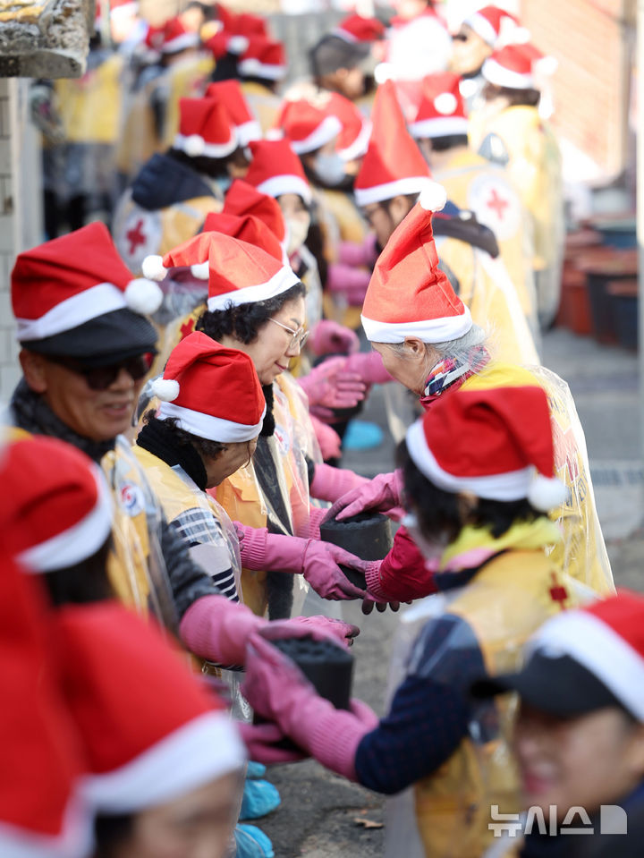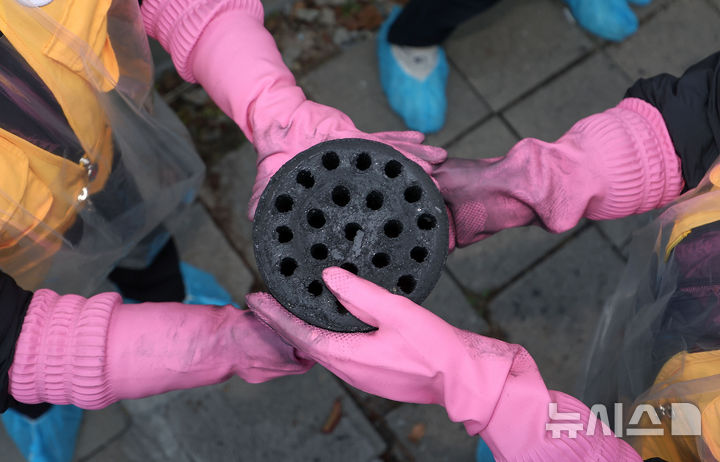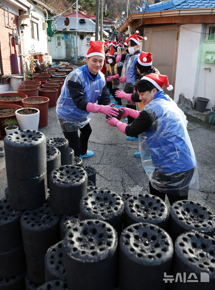【NEWSIS】赤十字ボラティアと高麗亜鉛の社員・役員が2日、ソウル市芦原区上渓洞で練炭分かち合いの奉仕活動を行っている様子。