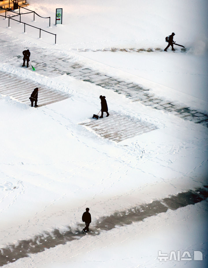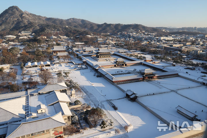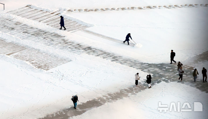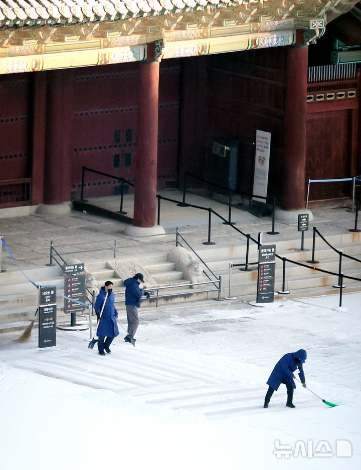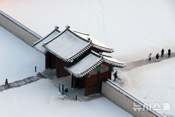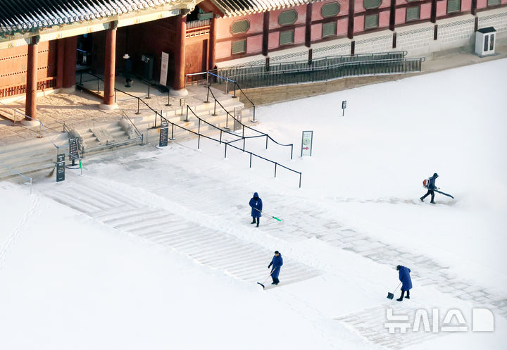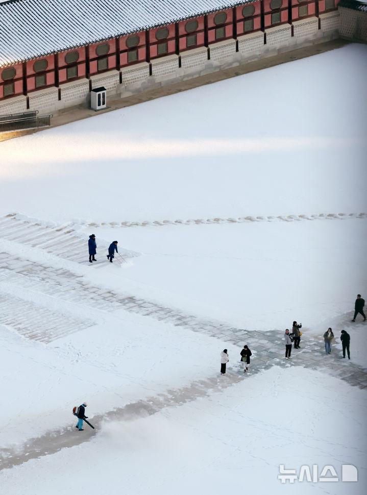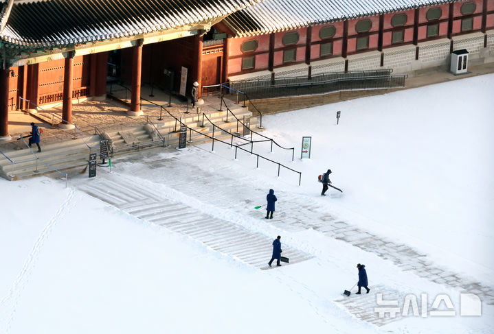 【NEWSIS】ソウルは4日夜に初雪が降った。写真は翌5日午前、ソウル市鍾路区の景福宮に積もった雪の様子。関係者らが通路の雪かきをした。