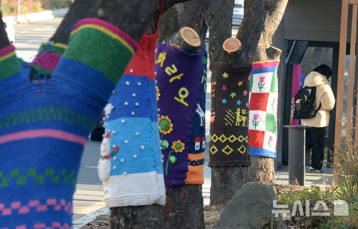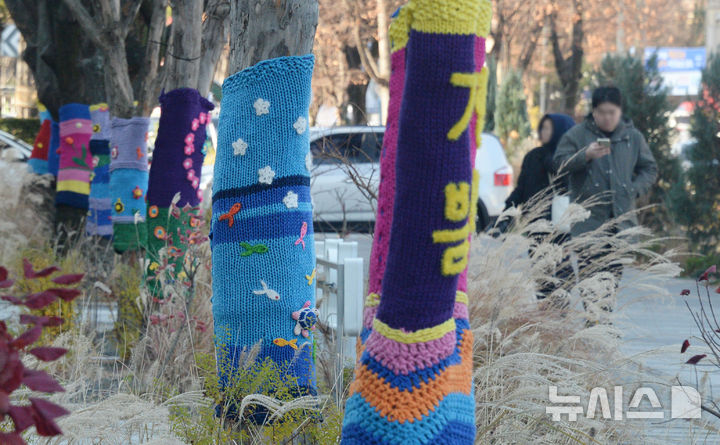 【NEWSIS】寒さが続いている8日、全羅北道全州市徳津区百済大路の街路樹に「ツリーハグ(こも巻き)」が施されている様子。