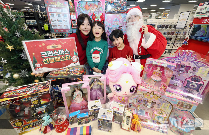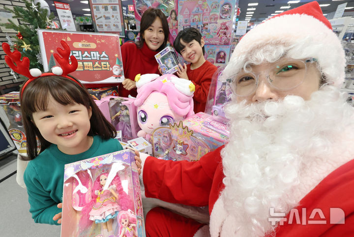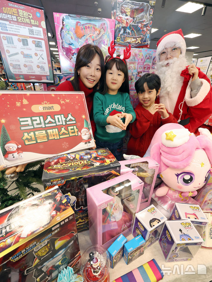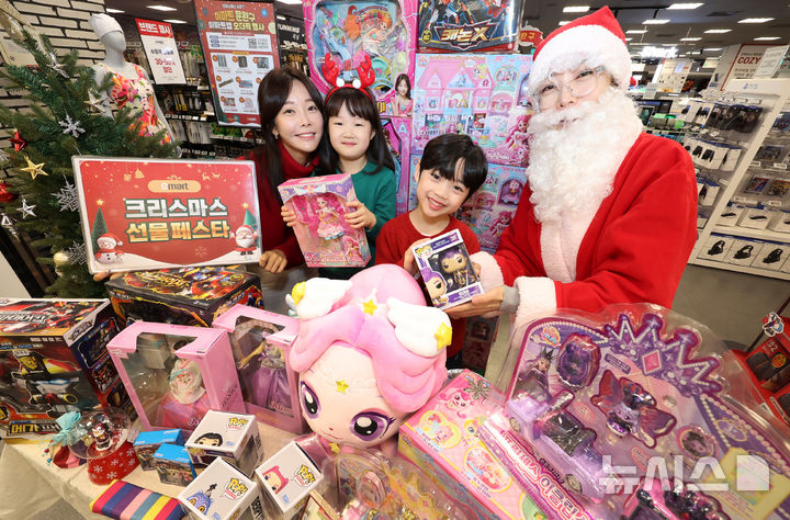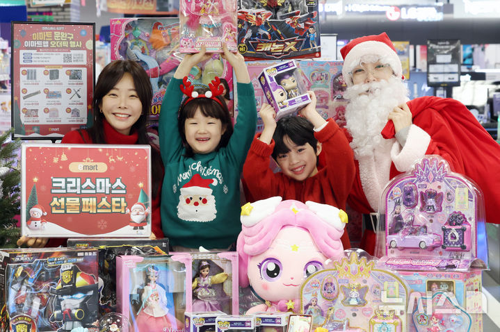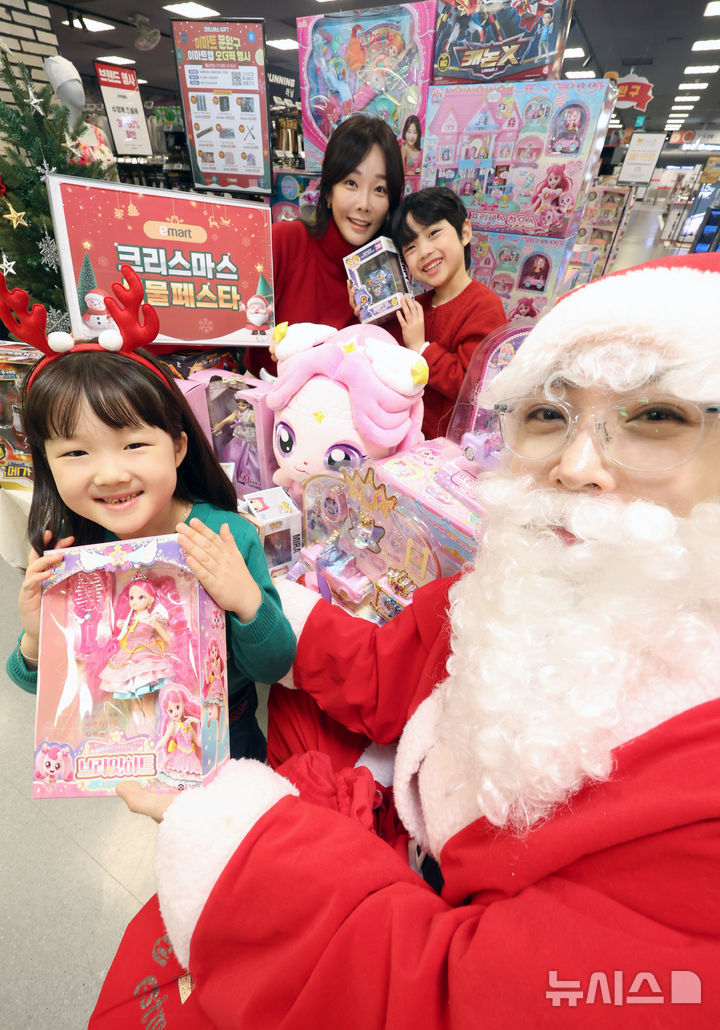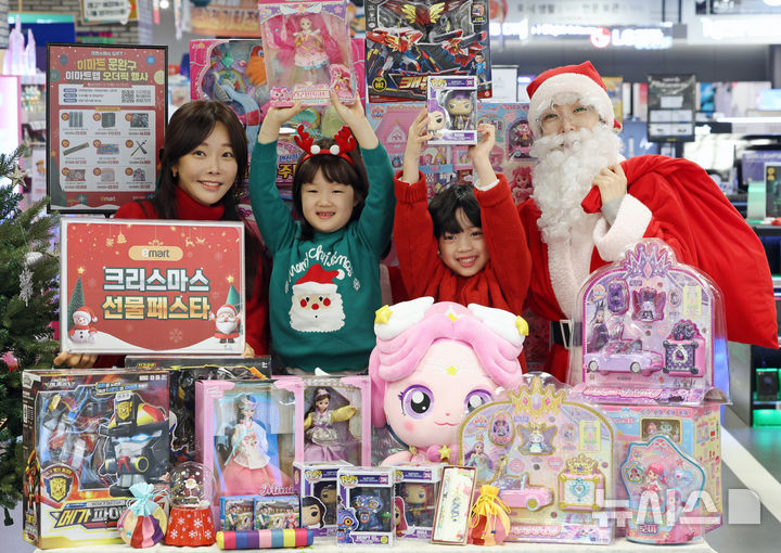 【NEWSIS】ソウル市竜山区の大手スーパー「Eマート竜山店」で11日午前、文房具・玩具のクリスマスギフトおよそ3000種類を最大50%割引で販売する「クリスマス・ギフトフェスタ」を紹介しつつ、各種の文房具・玩具を披露するコンパニオンの様子。