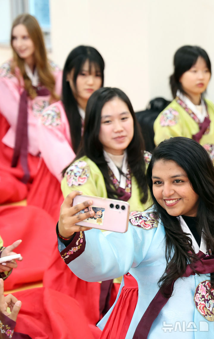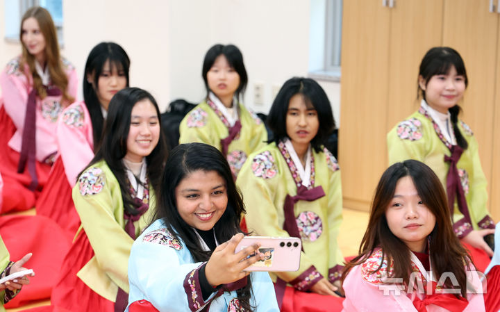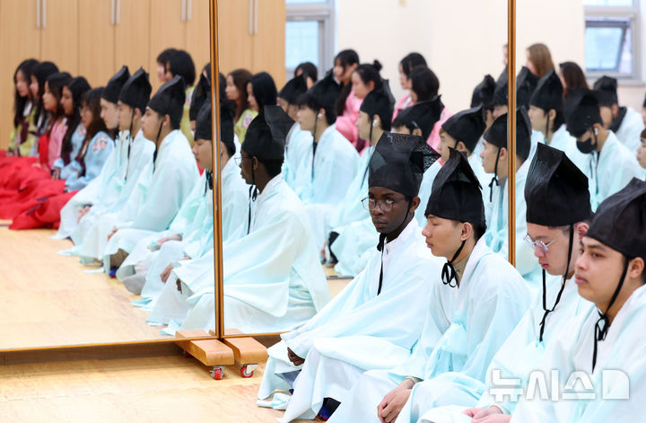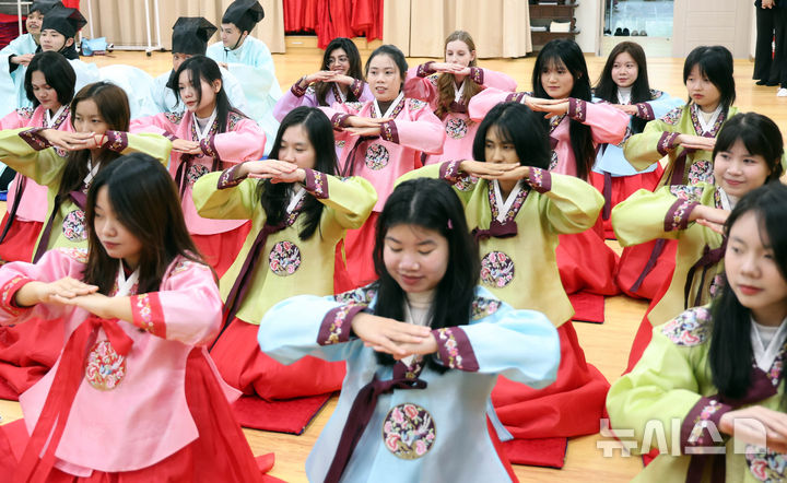 【NEWSIS】東西大学外国語教育院の韓国語研修課程に参加している外国人学生が11日、釜山市東莱区の忠烈祠にある安楽書院教育会館で、韓服(韓国伝統の衣装)で着飾って伝統礼節を学んでいるところ。