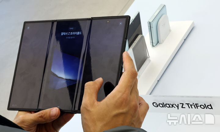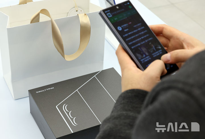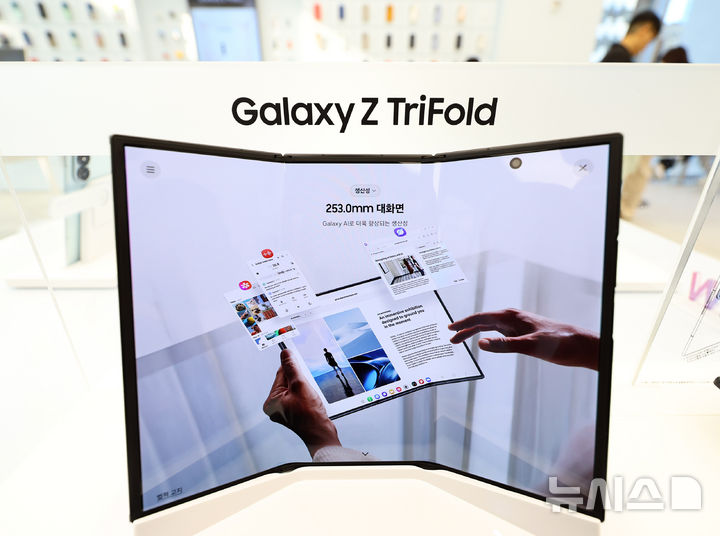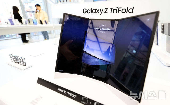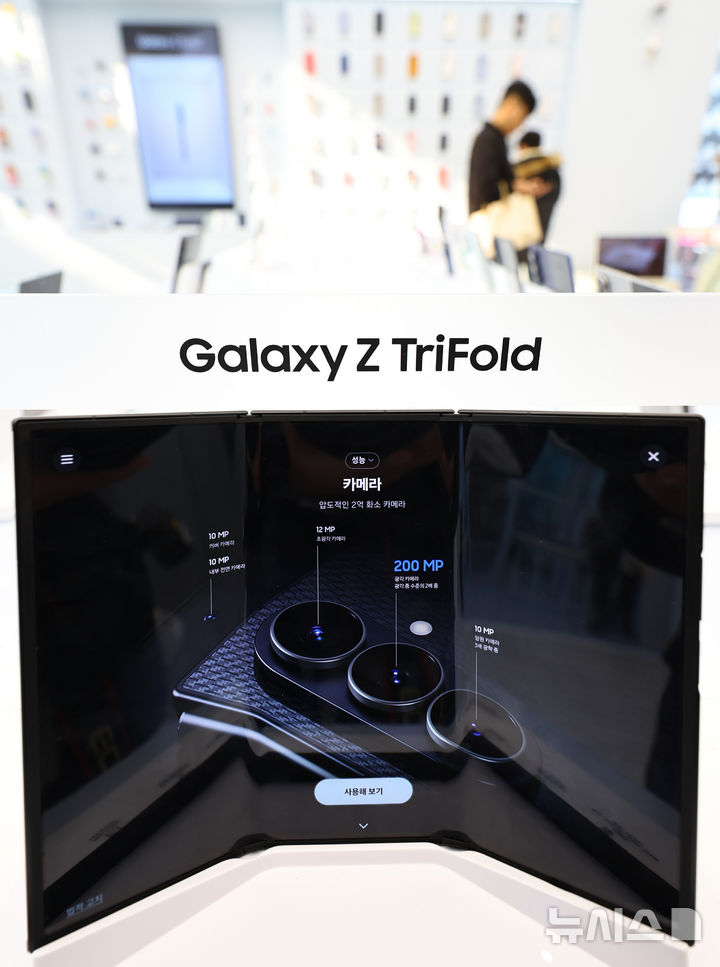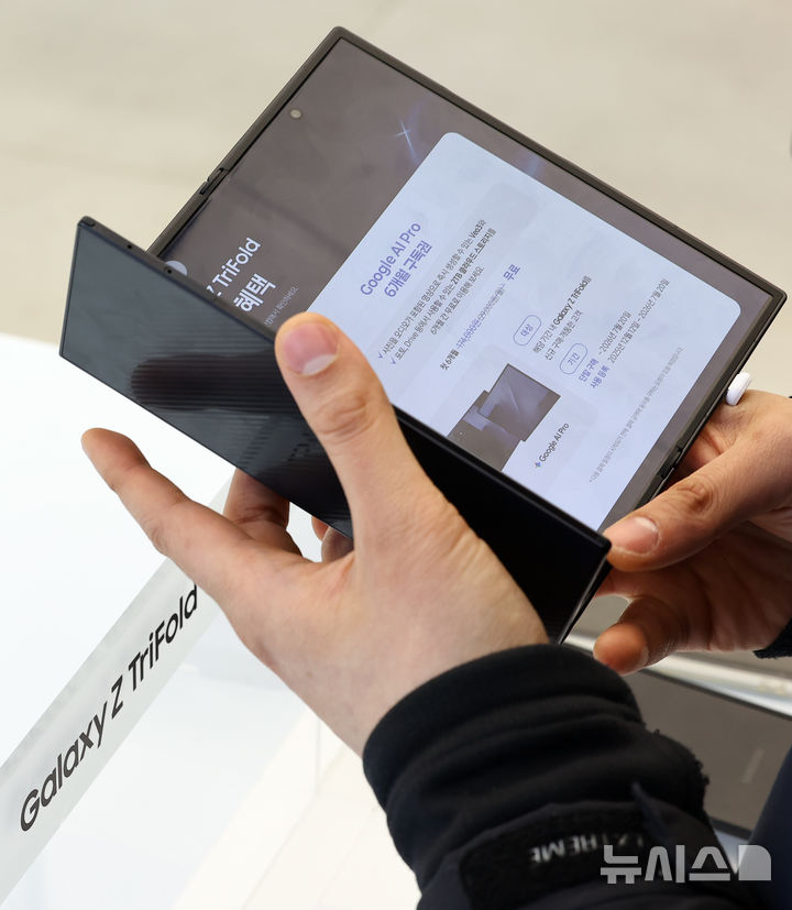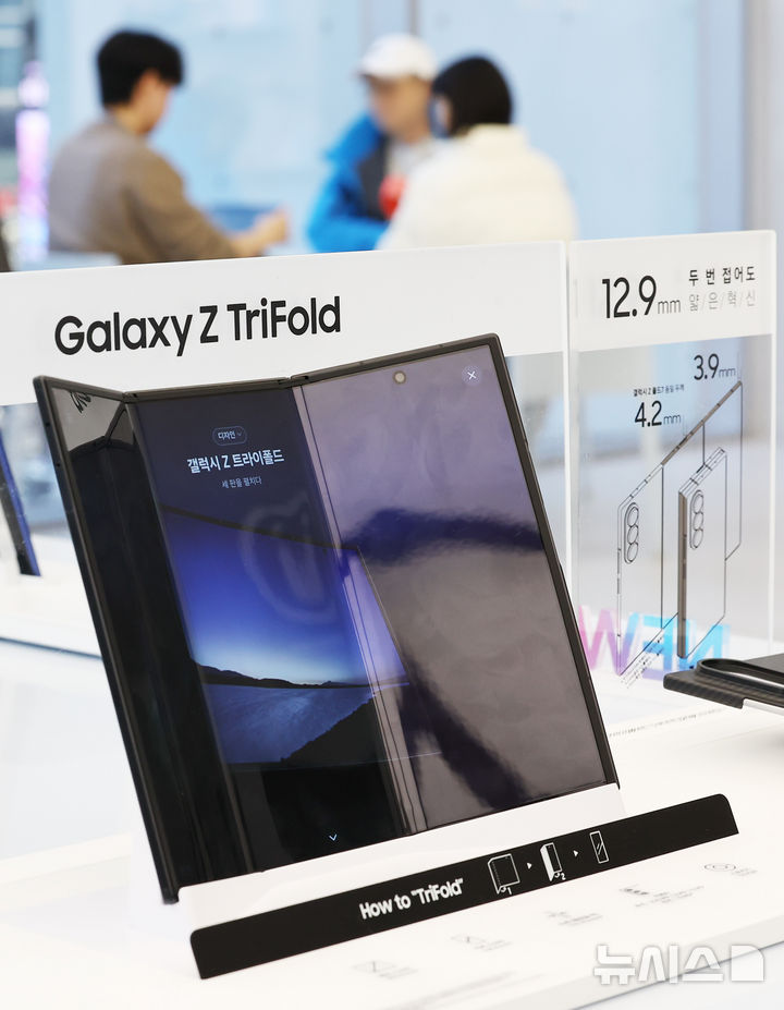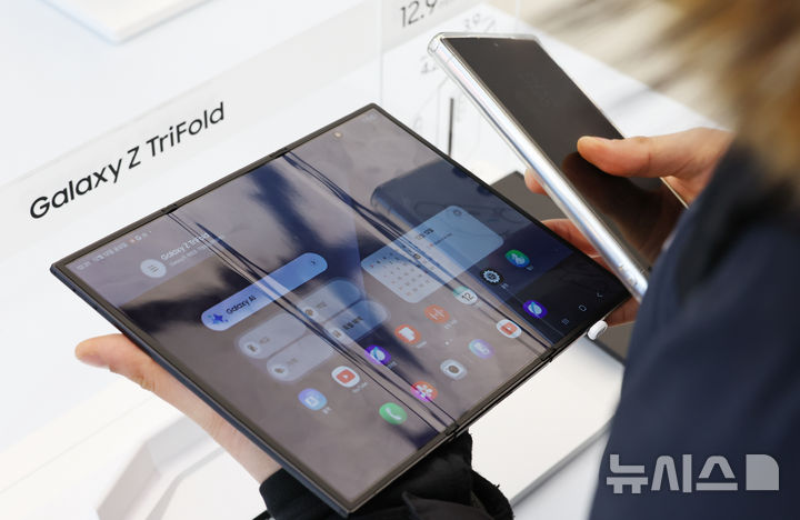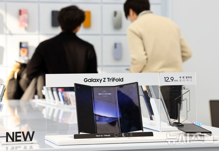 【NEWSIS】3段折り畳みスマホ「Galaxy Z TriFold」の韓国国内での販売が始まった12日、ソウル市瑞草区のSAMSUNG江南を訪れた人がGalaxy Z TriFoldを眺めているところ。Galaxy Z TriFoldは、広げると253ミリ(10型)の大画面が現れ、畳むと164.8ミリ(6.5型)の携帯性の高いバー(Bar)タイプの画面に切り替わるという、新しい形態のスマートフォンだ。
