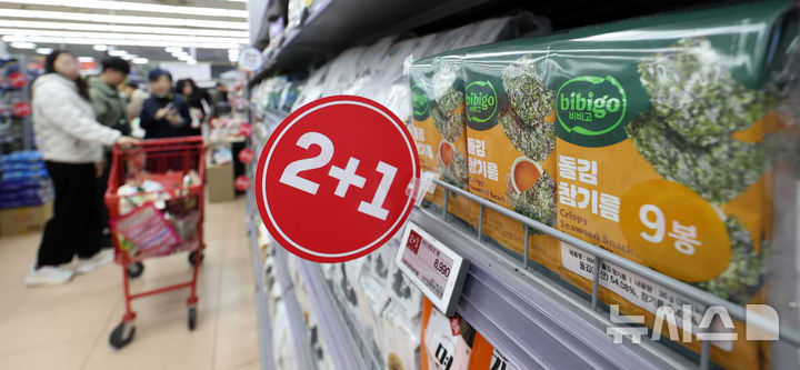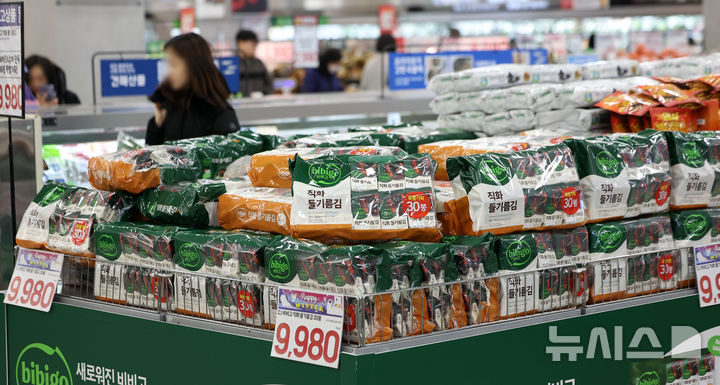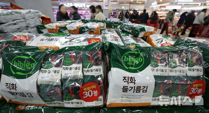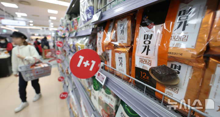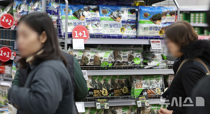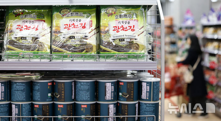 写真は14日、ソウル市内の大型スーパーで販売されているさまざまな韓国産味付けノリ。