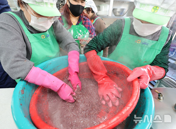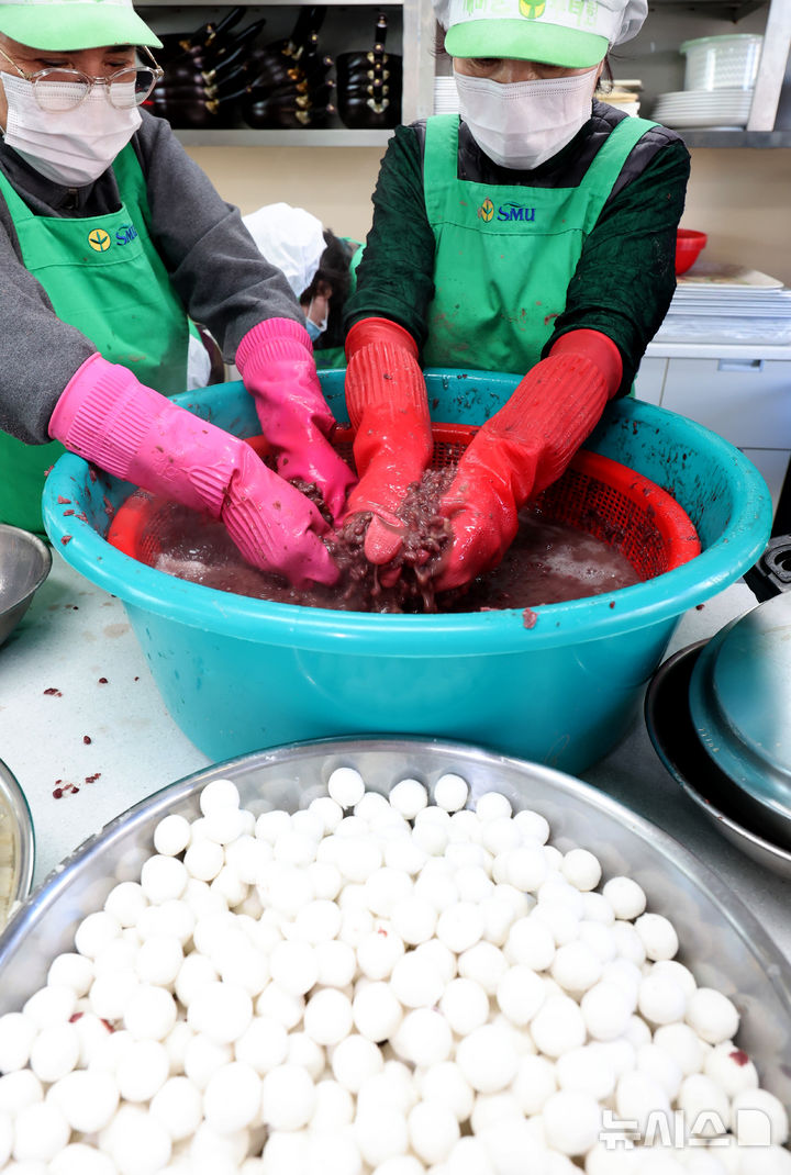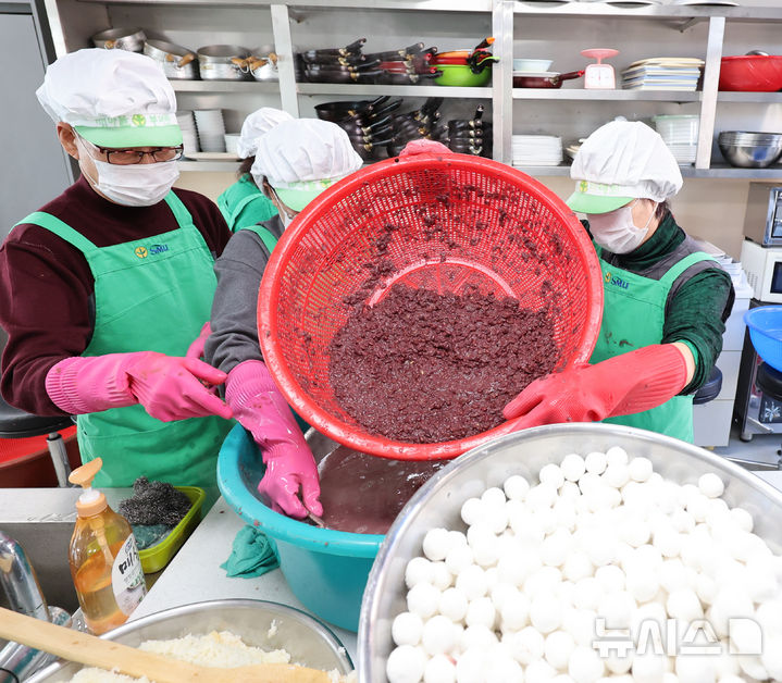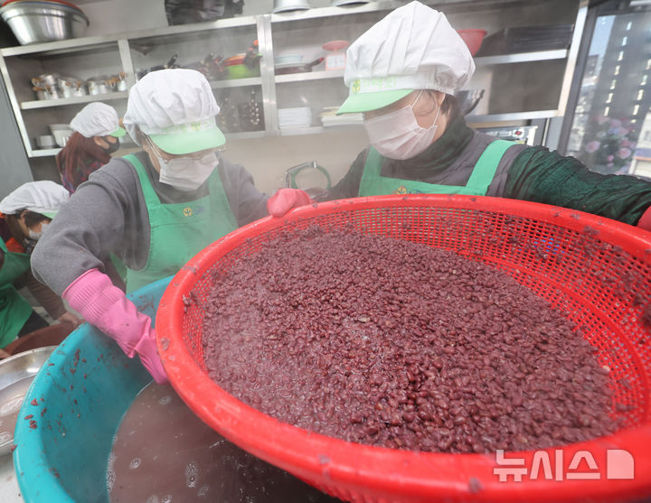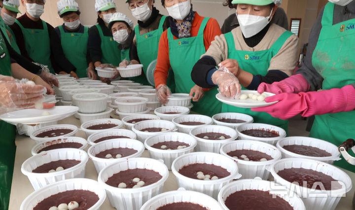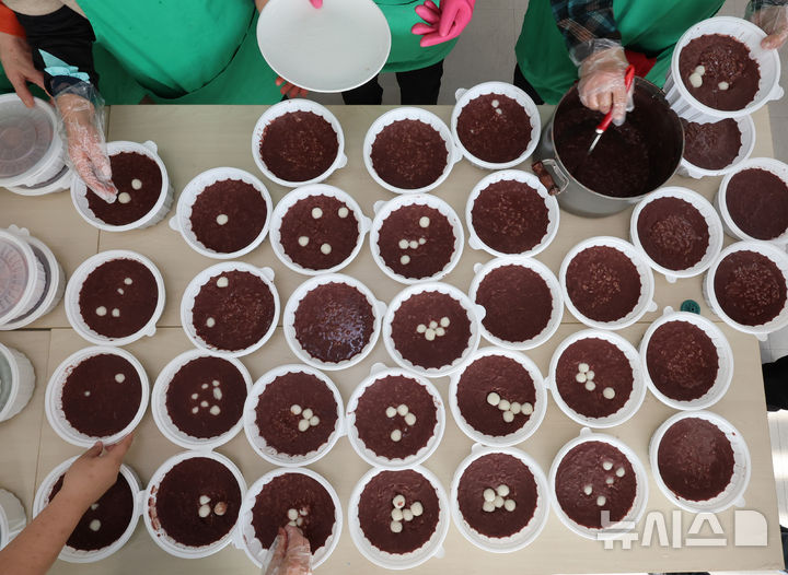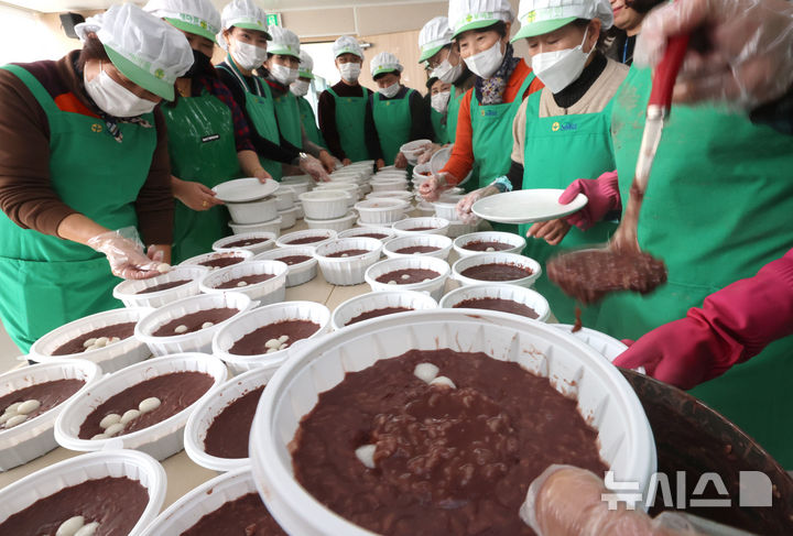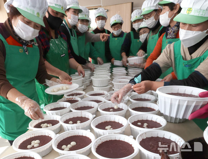【NEWSIS】冬至が間近に迫った18日午前、仁川市弥鄒忽区の竜現1洞4洞行政福祉センターでは、セマウル婦女会のメンバーが恵まれない階層のお年寄りに届ける「冬至小豆がゆ」とキムチの包装を行っていた。