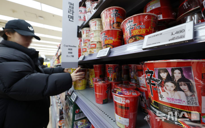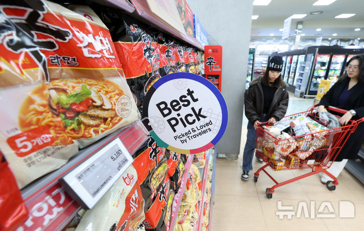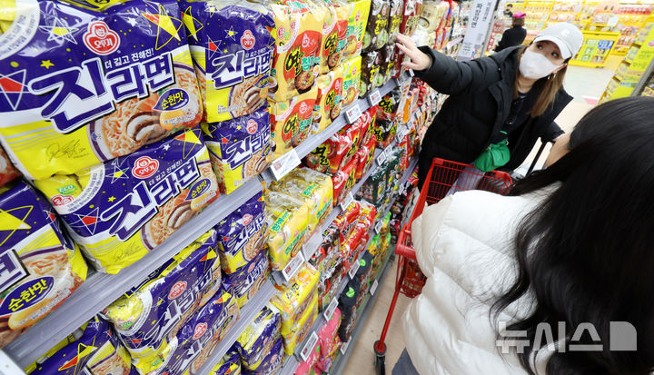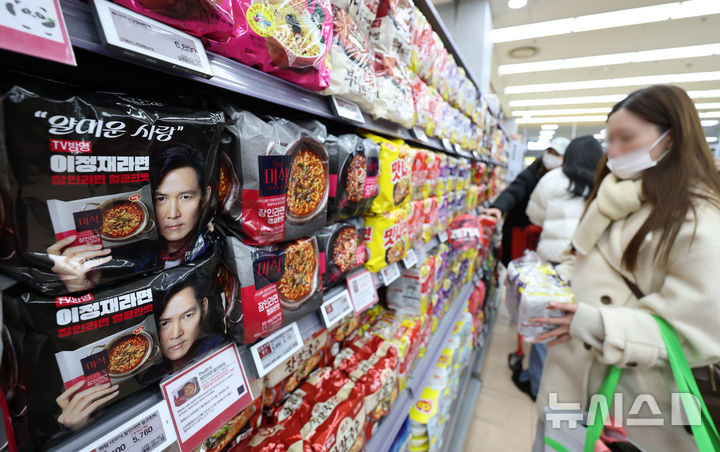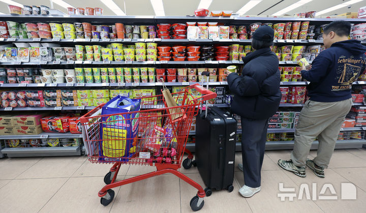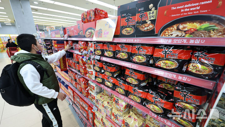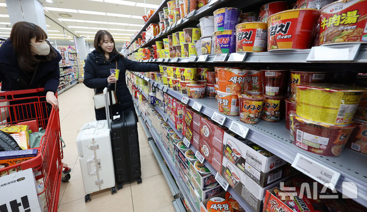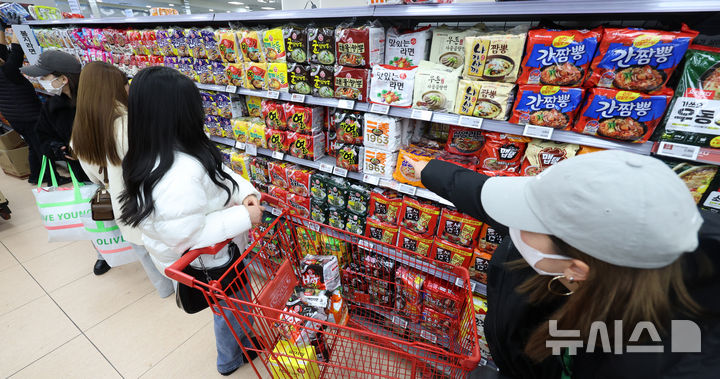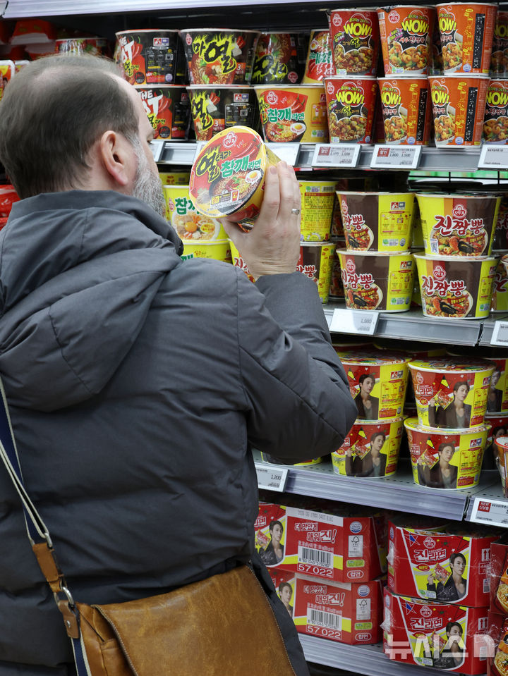 【NEWSIS】韓国のインスタントラーメン輸出額が2015年以降、11年連続で過去最高を記録するものとみられている。写真は17日、ソウル市内のある大型スーパーで、インスタントラーメンを買い求める外国人観光客たち。