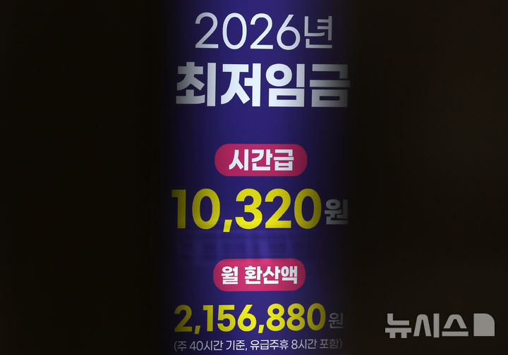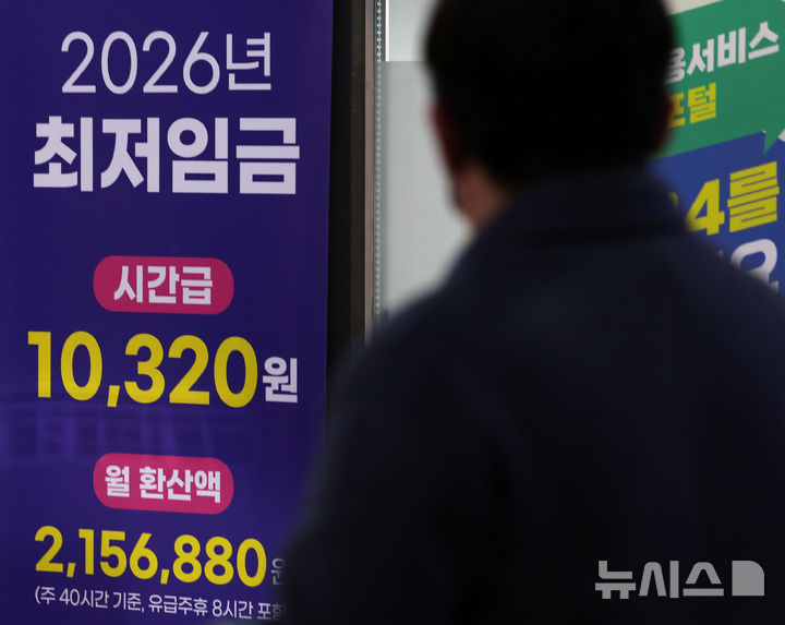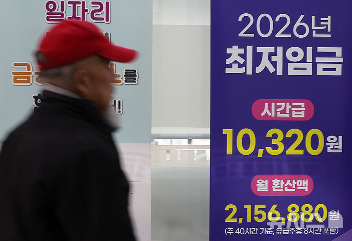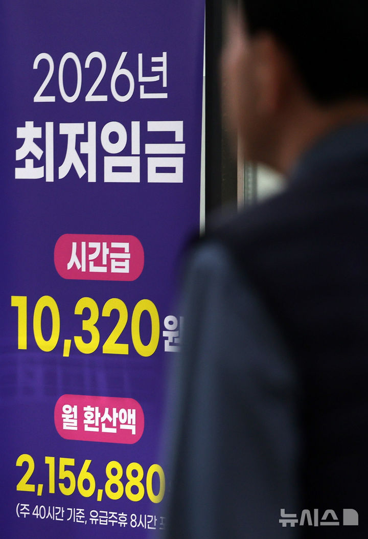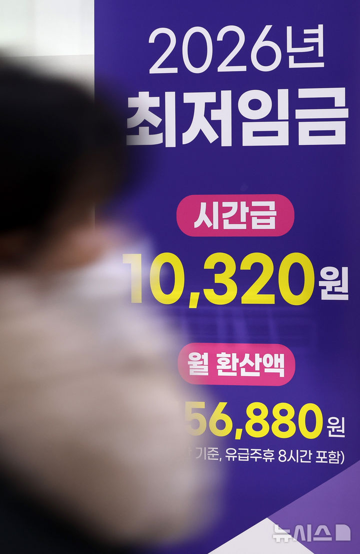 【NEWSIS】31日午後、ソウル市麻浦区のソウル西部雇用福祉プラスセンターに、来年度の最低賃金案内が掲示されている様子。2026年の最低賃金は2025年(1万30ウォン=現在のレートで約1085円。以下同じ)よりも290ウォン(約31円)=2.9%引き上げられ、1万320ウォン(約1116円)になる。