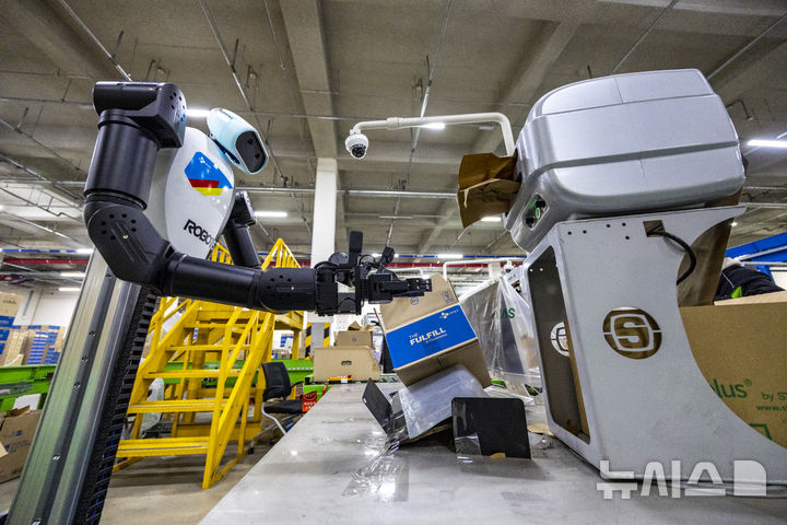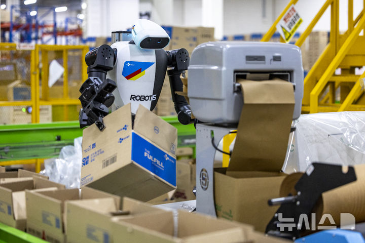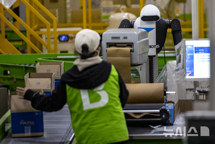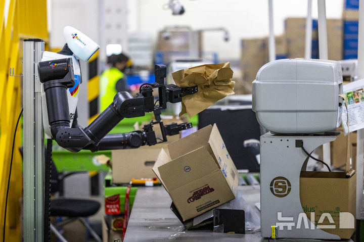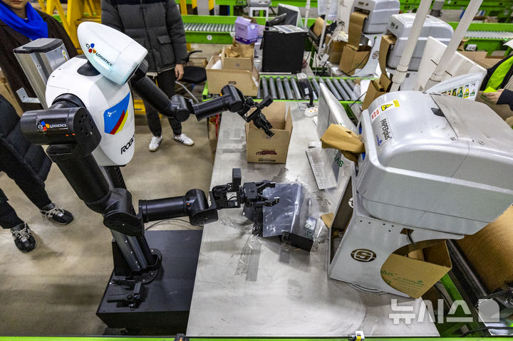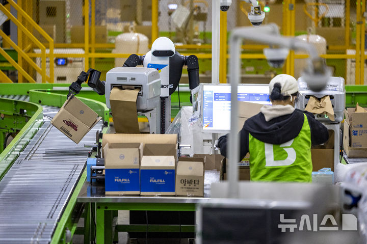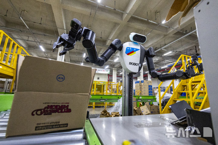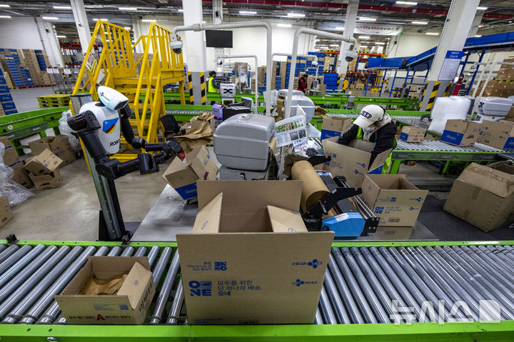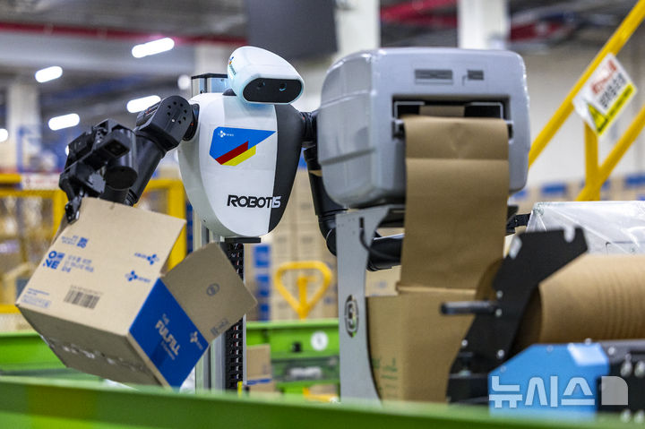 【NEWSIS】10日、京畿道軍浦市内にある韓国最大手ロジスティクス企業「CJ大韓通運」スマート・フルフィルメント・センターで、人工知能(AI)ヒューマノイドロボットが緩衝材補充・梱包(こんぽう)・段ボール積載などの作業をする様子。