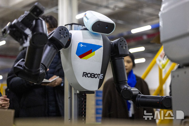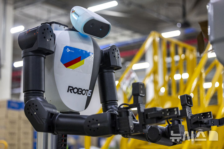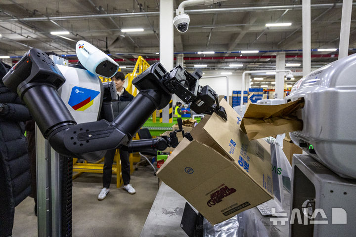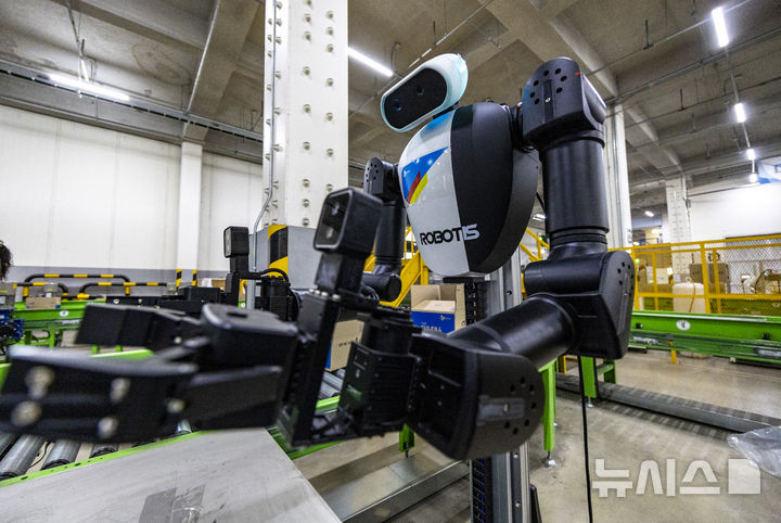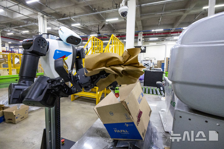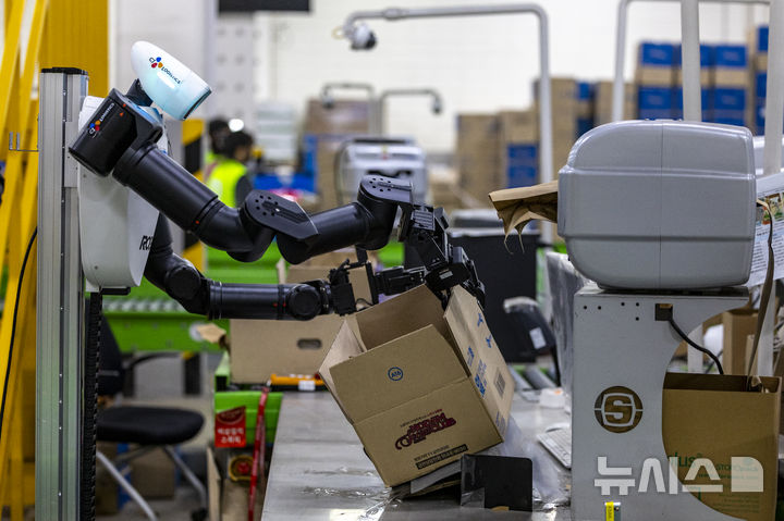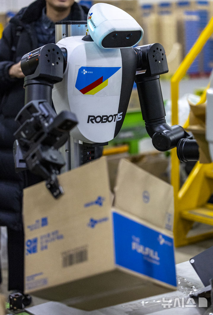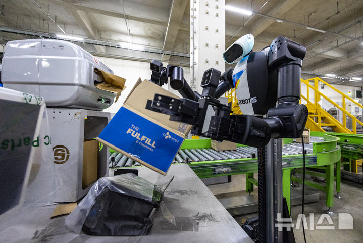 【NEWSIS】10日、京畿道軍浦市内にある韓国最大手ロジスティクス企業「CJ大韓通運」スマート・フルフィルメント・センターで、人工知能(AI)ヒューマノイドロボットが緩衝材補充・梱包(こんぽう)・段ボール積載などの作業をする様子。