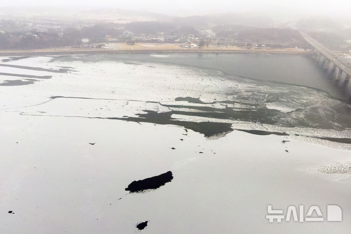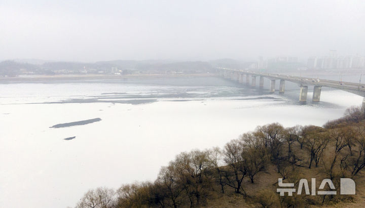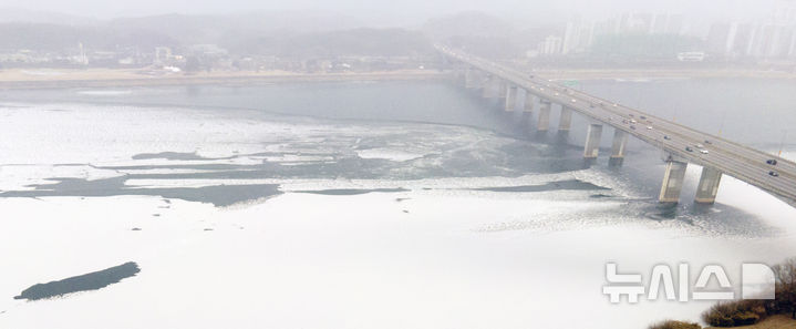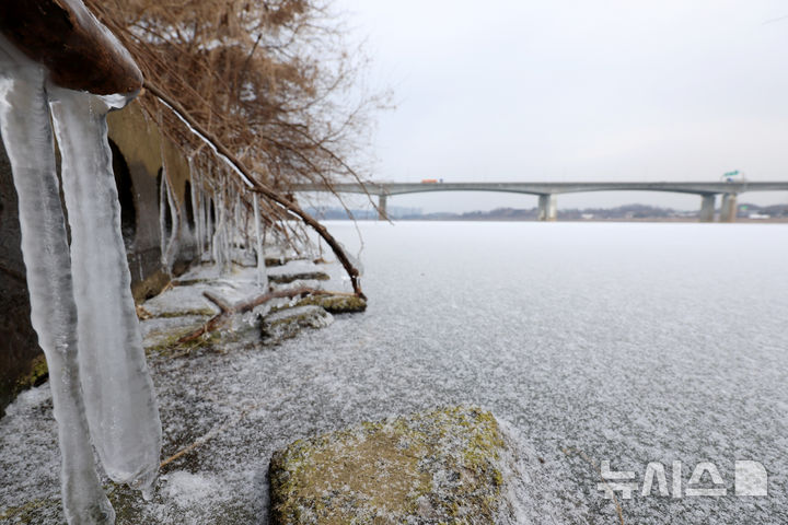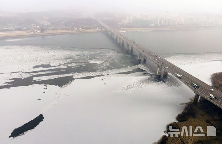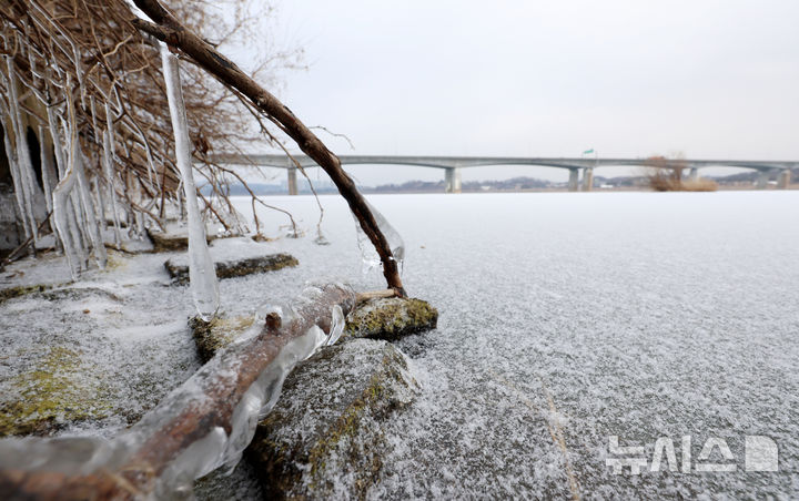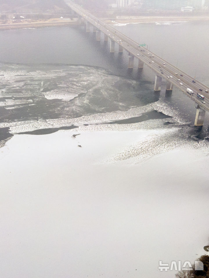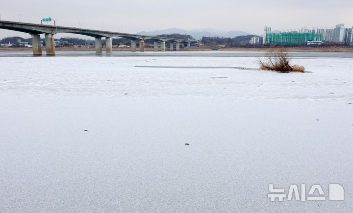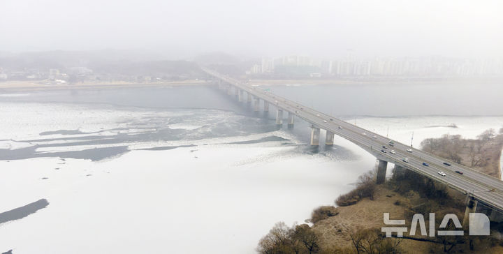 【NEWSIS】寒波が続いている12日、京畿道河南市の渼沙大橋付近では、凍り付いた漢江に雪が降り積もっていた。